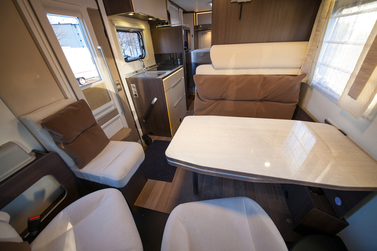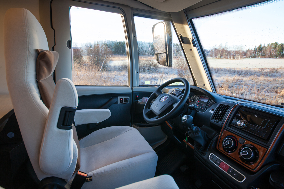 Istuinryhmässä on hyvin yleinen pohjaratkaisu: kahdenistuttava sohva oikealla, vasemmalla istuin yhdelle ja edessä kääntyvät ohjaamon istuimet. Vaikka pöytä on suuri, on kulku ohjaamoon helppoa.