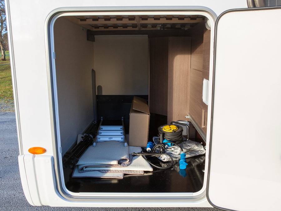 Takatalli on melko tilava. Sinne on luukku oikealla sivuilla. Takatallin mitat ovat 207 x 115 senttiä. Korkeutta on 105 cm. Talli on toisesta päästä kaasupullokaapin vuoksi hieman kapeampi, 75-senttinen. Takatalliin on pääsy myös sisältä. Vuoteen sälepohja nousee ylös kaasujousen avustamana. Märät monot voi sujauttaa päivän päätteeksi ulkoluukusta lämpimään takatalliin kuivumaan ja ottaa ne aamulla kuivana käyttöön sisäkautta.