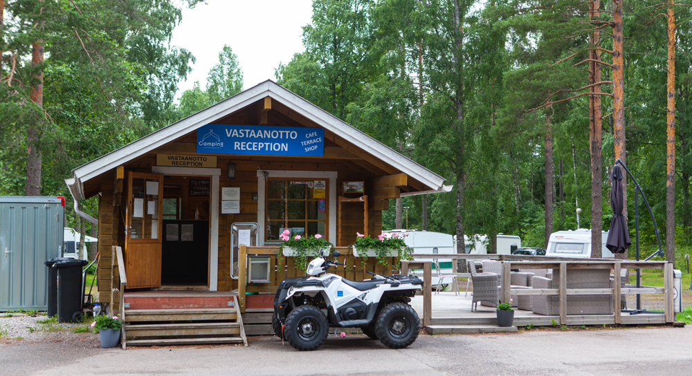 Toimistorakennuksen lähellä on karavaanareille huoltorakennus.
