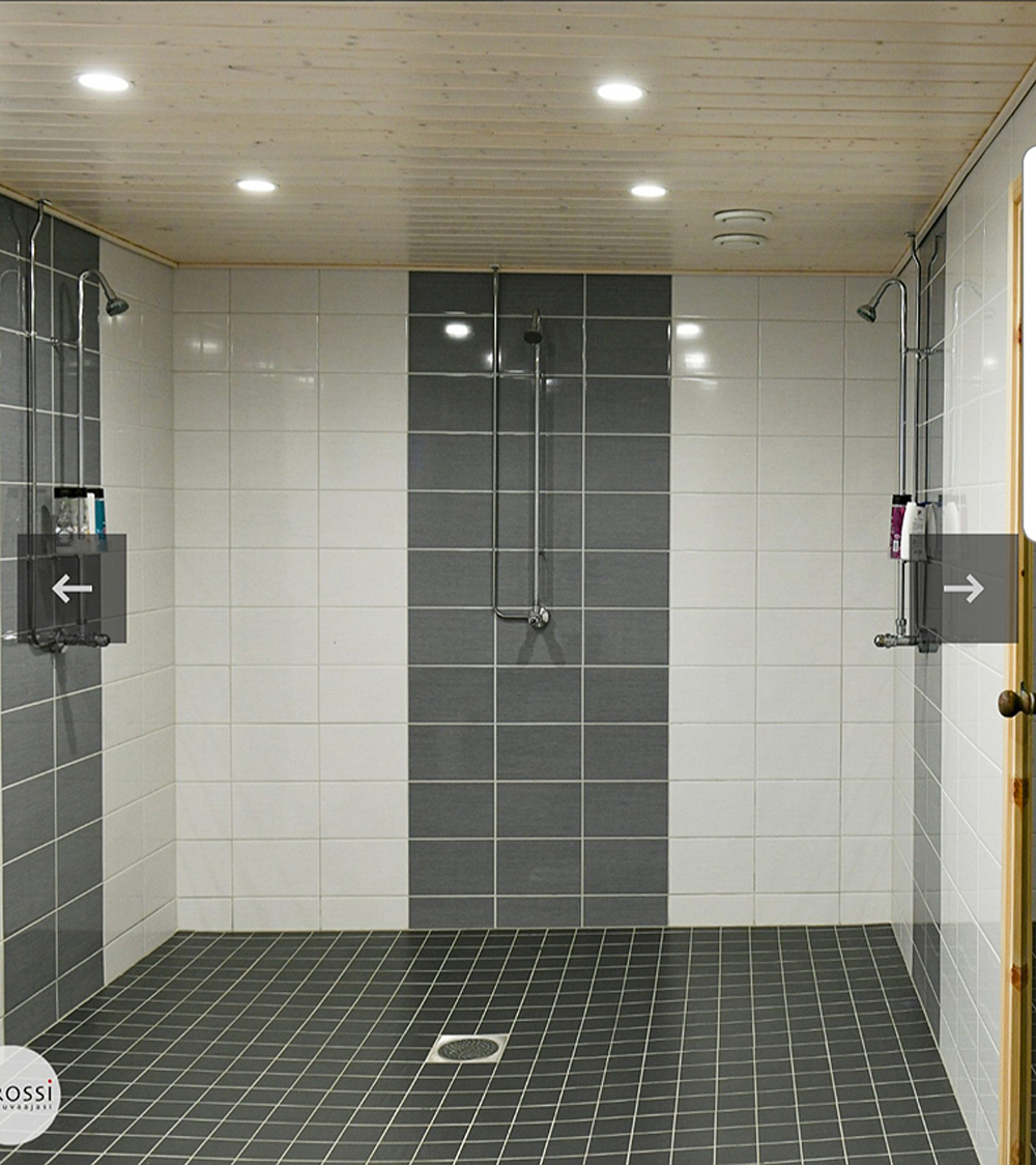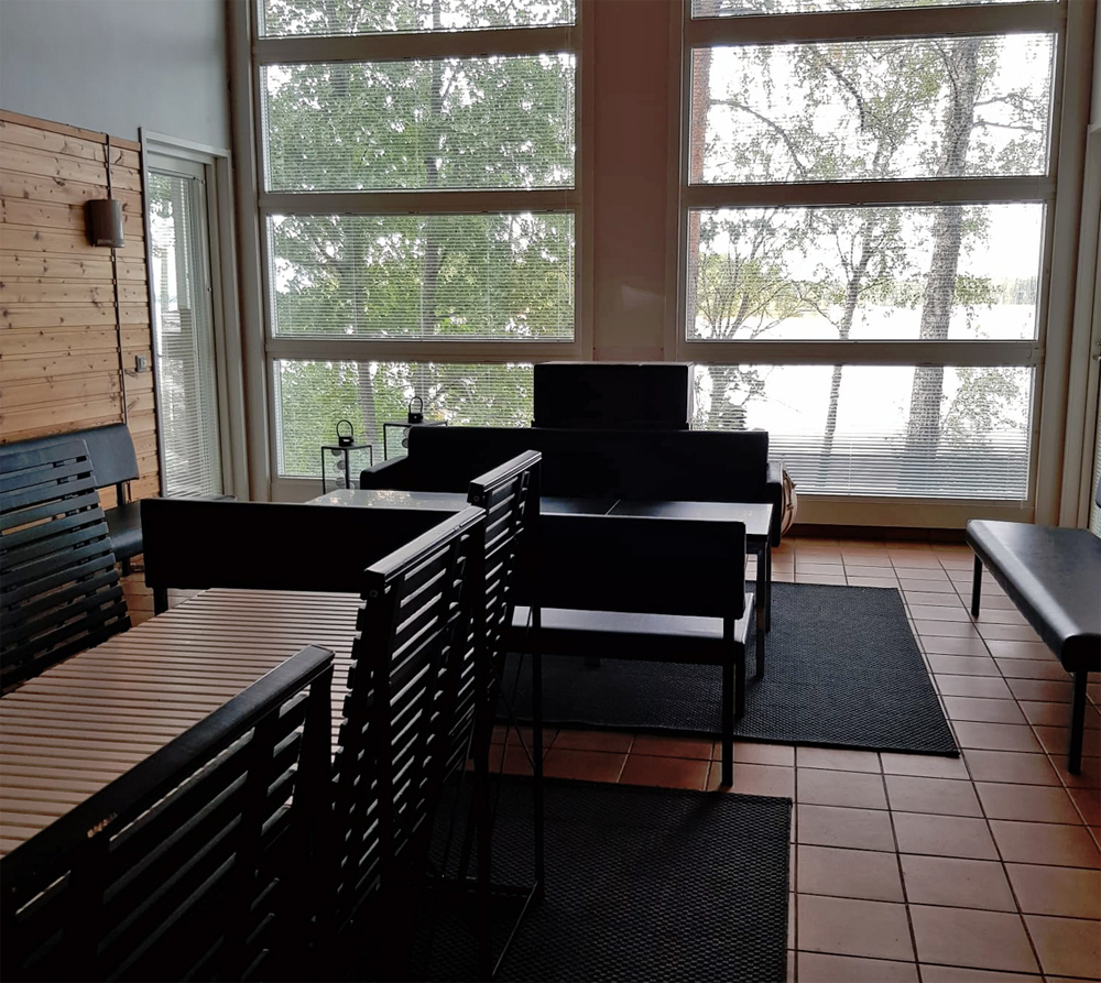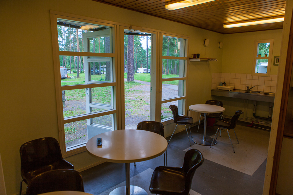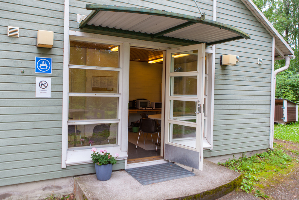 Toisesta päästä löytyvät vessa- ja suihkutilat. Järven puoleisessa päädyssä on paljon lasiseinää. Valoisasta tilata löytyy pari pöytää ruokailuun. Perällä on tiskipaikka ja pieni keittiötila, jossa on sähkölevyt, miniuuni, mikro, vedenkeitin ja kahvinkeitin. Ei mikään luksusvarustus mutta toimiva.