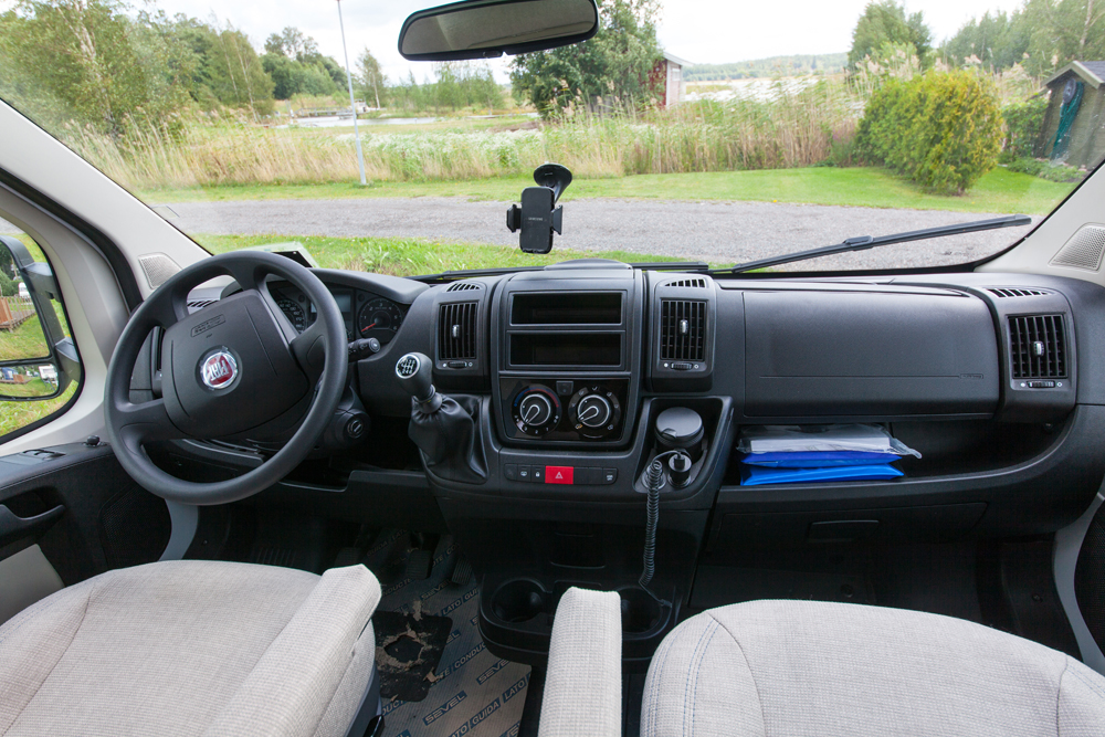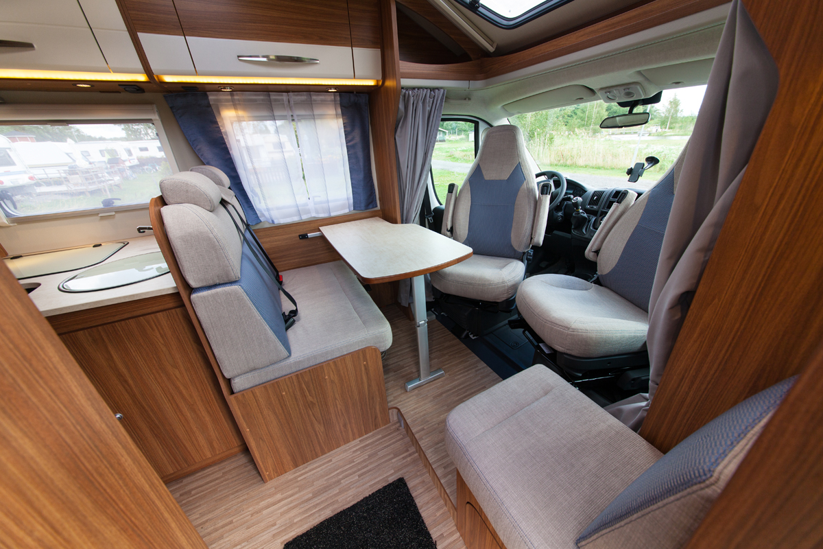 Istuinryhmä pöydän ympärillä on istumatilaa viidelle. Viiden hengen ruokailuun pöytä on kapeahko, mutta jatkettavissa pituussuunnassa 25 sentin irtopalalla, jolloin oikealla seinustalla istuva ylettyy paremmin. Parhaat ja avarimmat paikat ovat ohjaamon ympärikäännettävillä istuimilla.