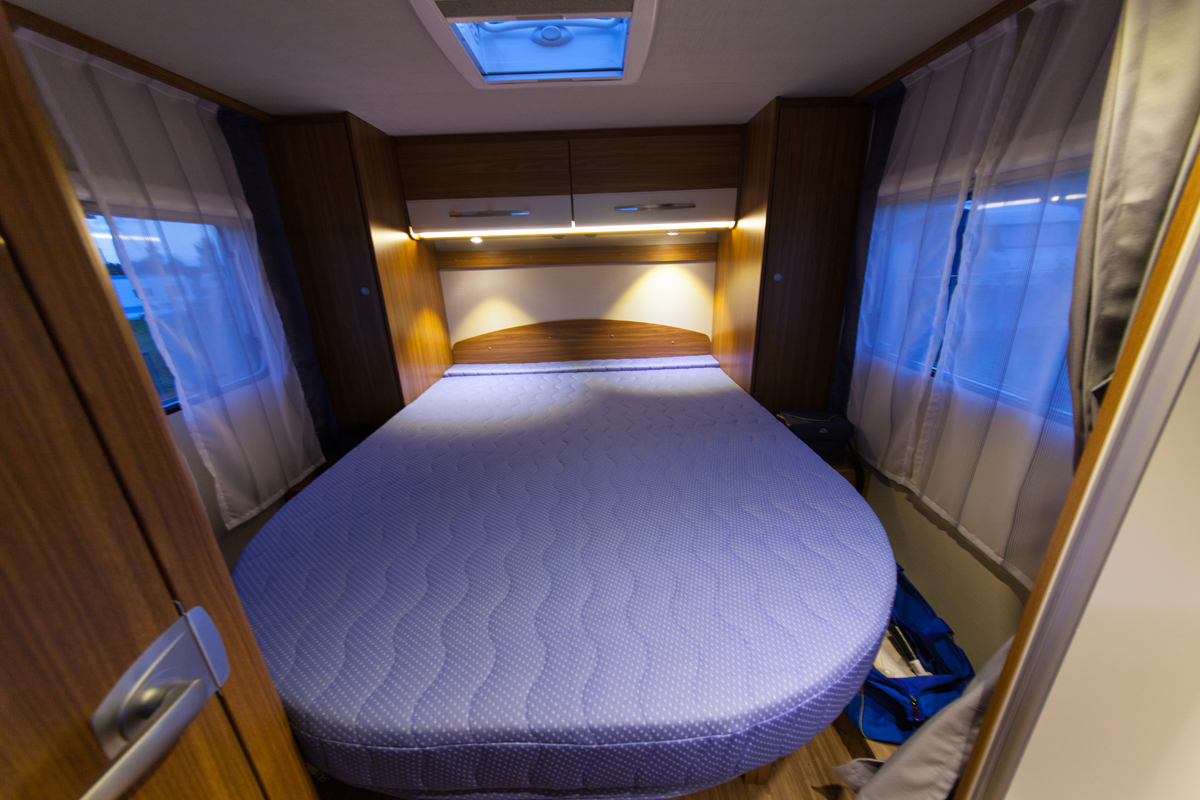 Makuuhuonetta hallitsee 150 senttiä leveä parivuoden keskellä autoa, ns. saarekevuode. Vuoteen pituus on lyhyenä 170 senttiä ja jatkettuna 190 cm. Pitkäksi vedettynä vuode on kiinni vessan seinässä (kuvassa vasemmalla), jolloin vaatekaapille ei pääse. Tähän auttaisi vessan nurkan pyöristäminen, joka on tietysti rakenteena hieman kalliimpi ratkaisu.