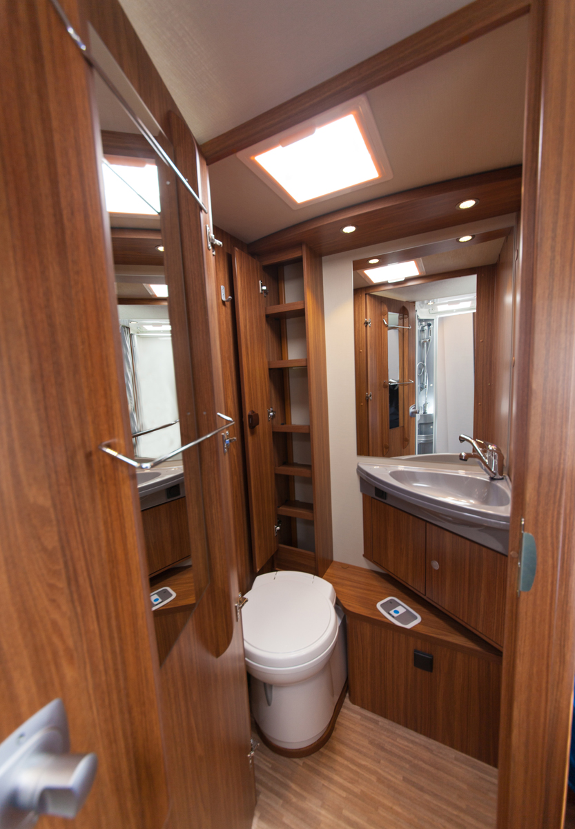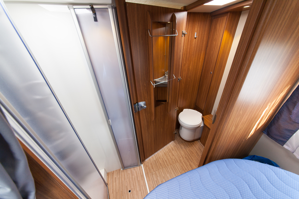 Carado T 399:ssä on vessalle ja suihkulle oma tilansa. Vessa on oikealla ja suihku vasemmalla.
