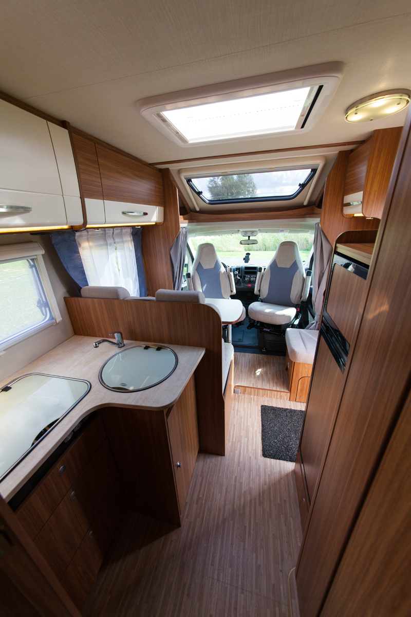Keittiö on keskellä autoa vasemmalla puolella. L-mallinen työtasoon on upotettu kolmeliekkinen kaasuliesi ja pyöreä teräsallas.