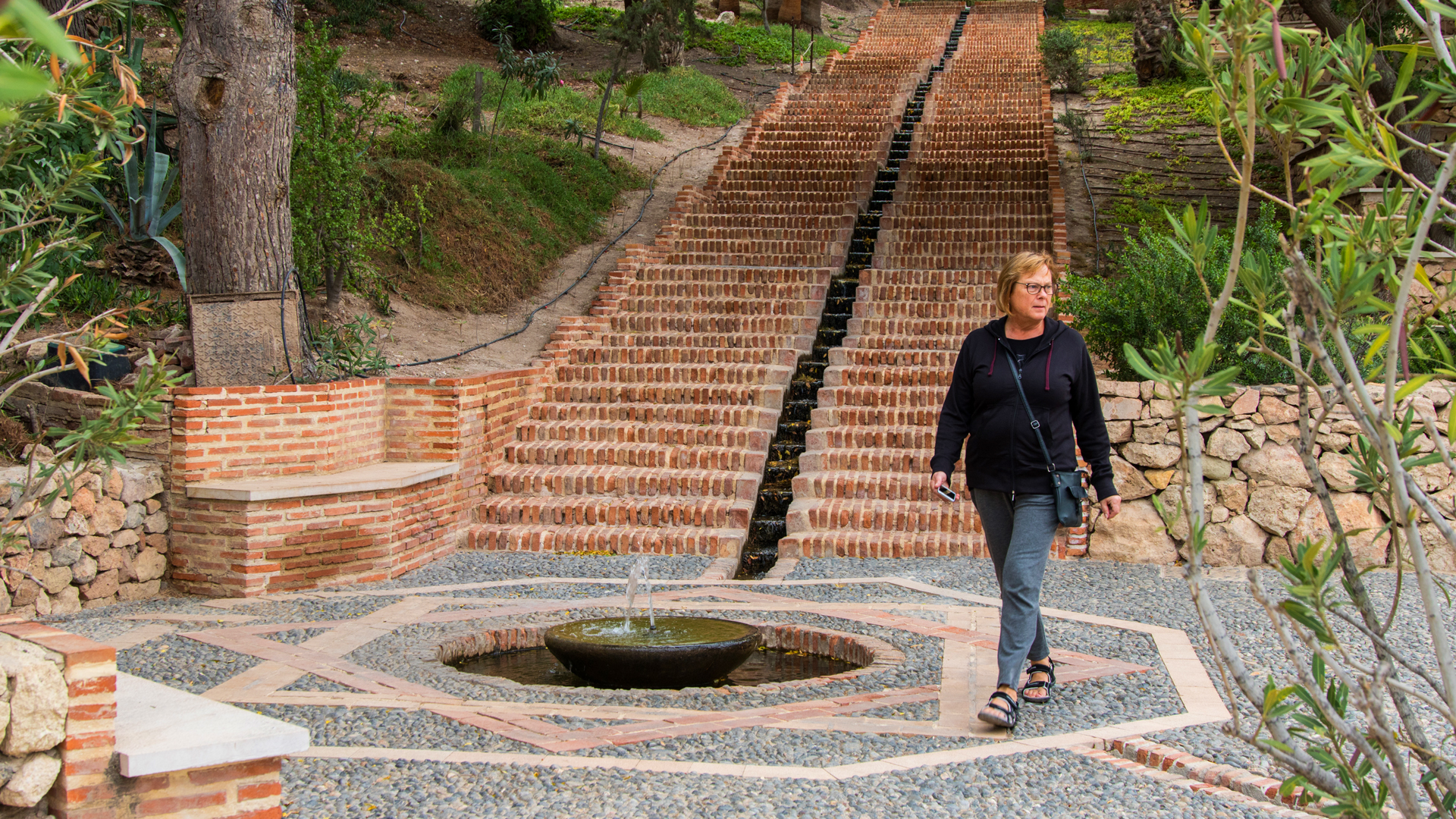 Linnan keskellä on palatsialue, jossa arabien mieltymys erilaisiin vesiaiheisiin näkyy kalalampina, suihkulähteinä ja portaiden välissä soljuvina puroina. Kierrämme kivisiä käytäviä ja kiipeämme portaita. Tuuli on tyyntynyt eilisestä mutta onneksi ei ole hellepäivä.
