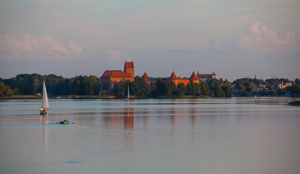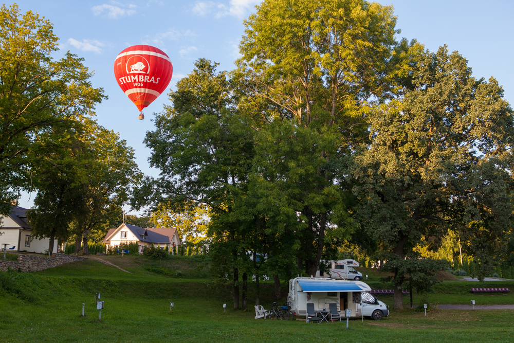 Me emme ole kovin kuuluisia, mutta päätämme silti vierailla alueella. Majoitumme helteisenä elokuun iltapäivänä Slenisin kartanomaiselle caravan-alueelle. Viiden tähden Slenis sijaitsee järven rannalla, vastapäätä Trakain kaupunkia. (Alue ei täytä Suomen viiden tähden vaatimuksia.)