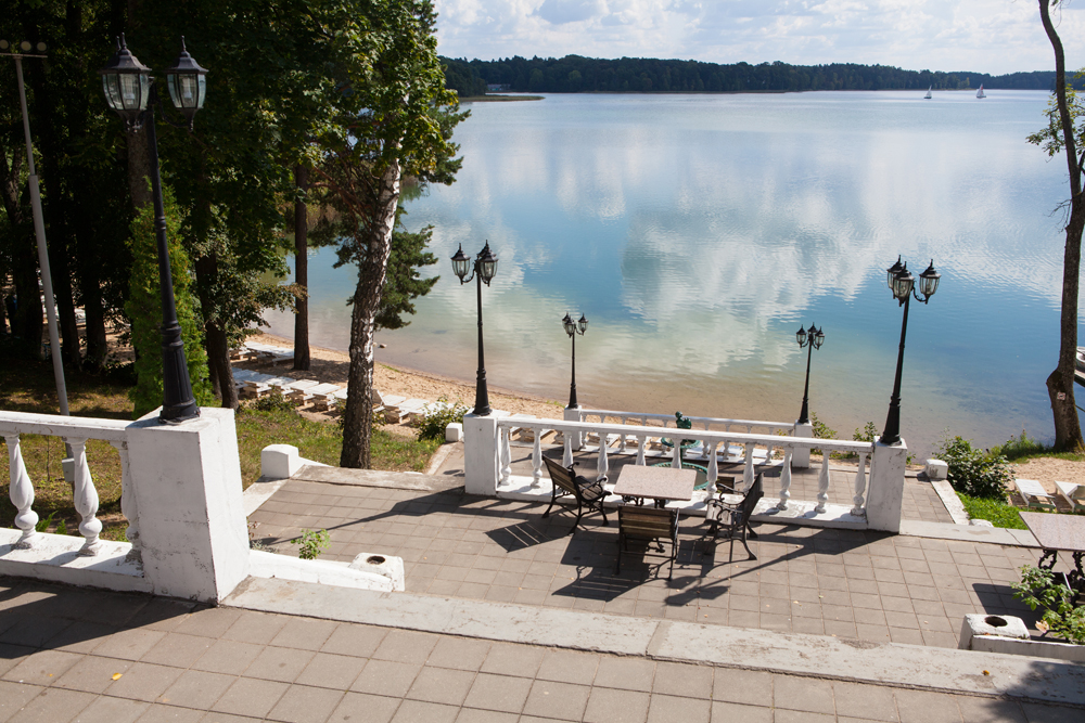 Leiriydyttyämme laskeudumme komean järvenrantahuvilan kiviportaita alas hiekkarannalle, jossa pitkä rivi puisia aurinkotuoleja odottaa. Vesi on lämmintä ja hyvin puhdasta.