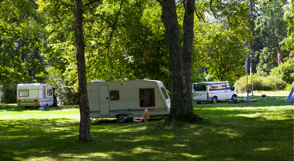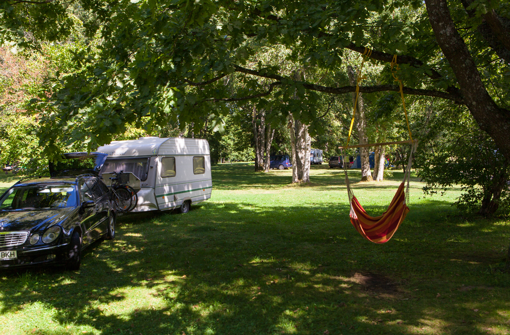 Kempings Jurmalan melko laaja nurmikenttä on viihtyisästi isojen puiden siimeksessä.
