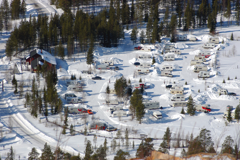 Caravan-alue on talvella hiihtokeskuksen pysäköintialueen vieressä. Sähköpaikkoja 20.