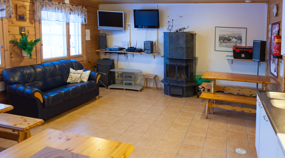 Saunarakennuksen toisessa päässä on tilava kokoontumistila, jossa on keittiö, takka sekä karaoke-laitteet ja videot.