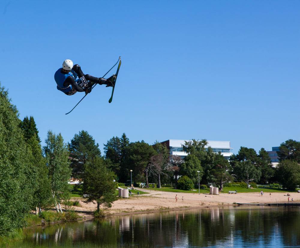 Freestyle-laskijoiden kesäharjoituspaikaksi on leirintäalueen rajalle rakennettu hyppyri, josta loiskautetaan hallitulla – tai hallitsemattomalla hypyllä järveen.