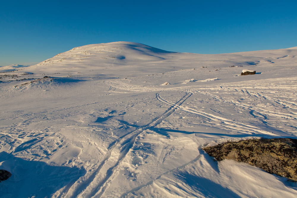 Saanan huipulle vie neljäkilometrinen polku ja se on usein kevättalvellakin niin tuulen kovettama että sinne pääsee ilman suksia tai lumikenkiä.