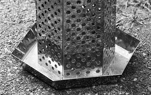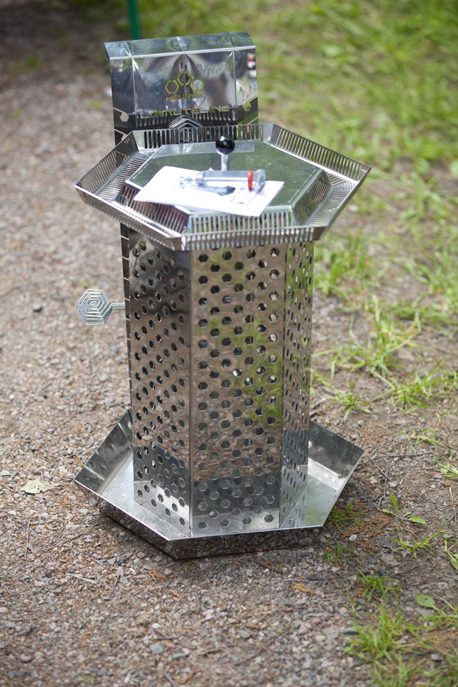 20120608_erames40v_ (1120)Heurex KlapiTuli on ruostumattomasta kromiteräksestä valmistettu reiällinen pönttö, jossa poltetaan puita pystyasennossa. Materiaali ja muoto on sellainen, että tulisija ei vääntyile lämmetessään. Korkeutta on 50 senttiä. Puut palavat pystyssä turvallisesti ja lämmittävät mukavasti ympärilläistujia päästä varpaisiin, koska lämpösäteily ulottuu maahan asti.