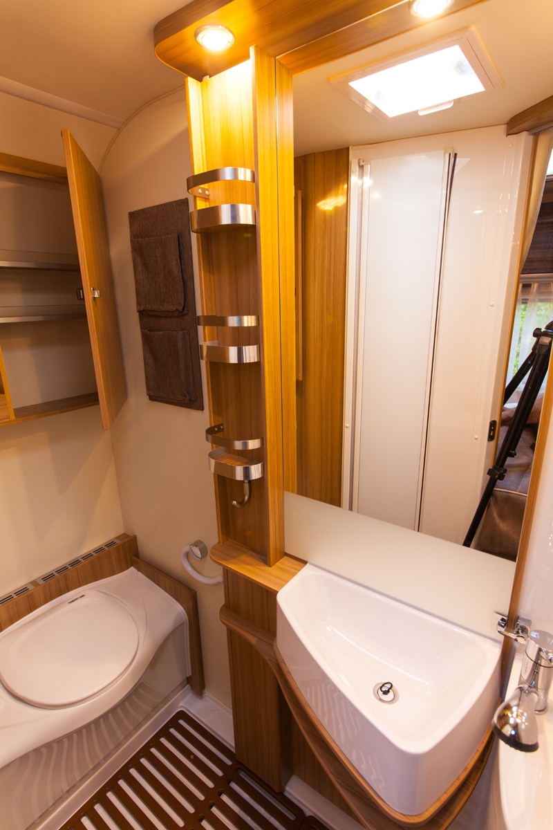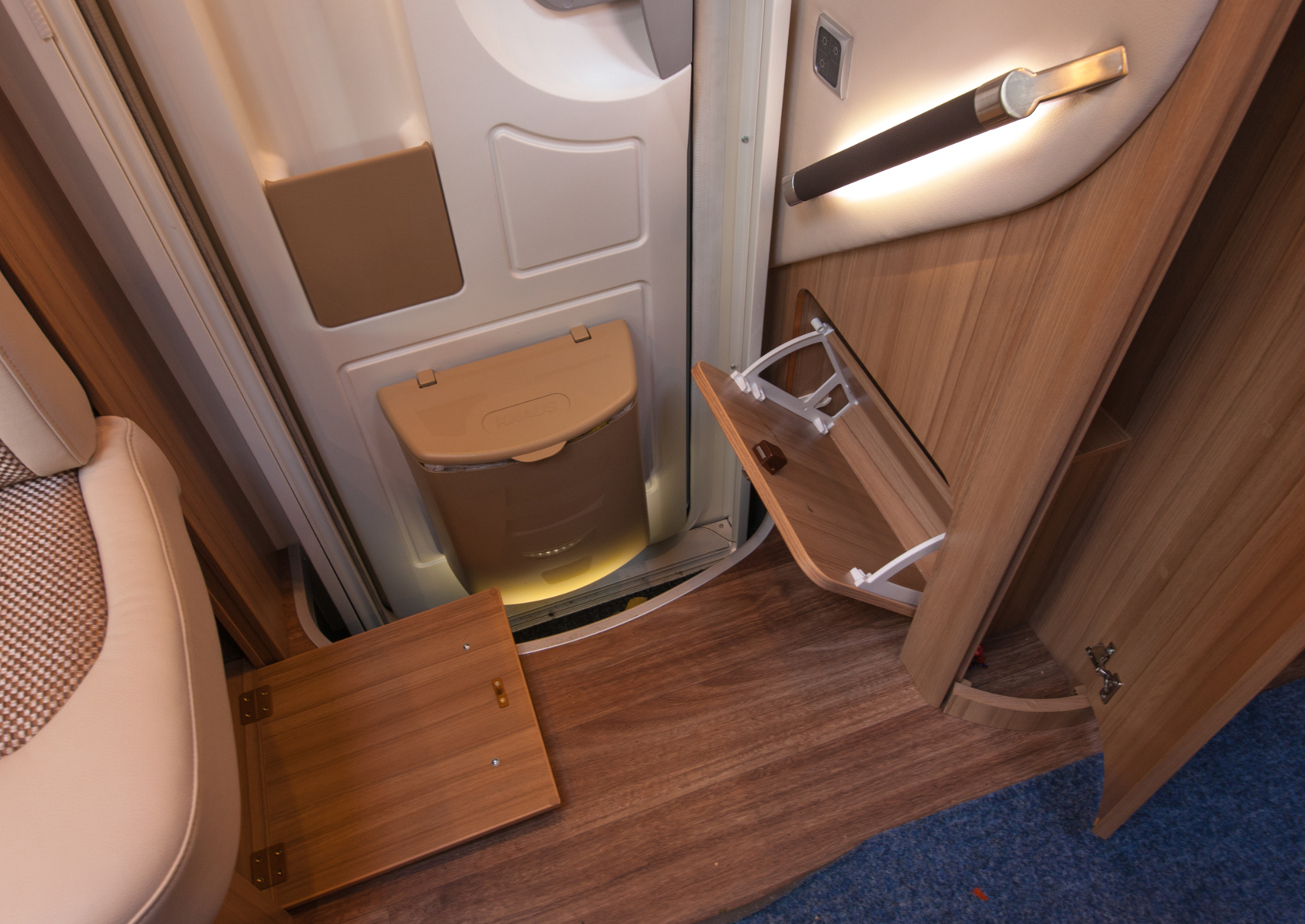 WC-tilassa auton vasemmassa takakulmassa on kemssa aivan takana Kemssan etupuolella oven edessä on pesuallas. Väljyyttä on mukavasti. Suihkutilana käytetään vessan etuosaa. Pesuallasseinä on saranoitu ja se käännetään suihkun ajaksi vessan eteen.