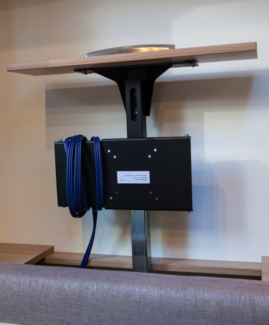TV kätkeytyy oikeanpuoleisen sohva takaa ylösnousevaan telineeseen. Lokerossa on johdotukset valmiina ohjaamon viihdekeskuksen multimediasoittimeen, joka toistaa CD- ja DVD-levyjä.