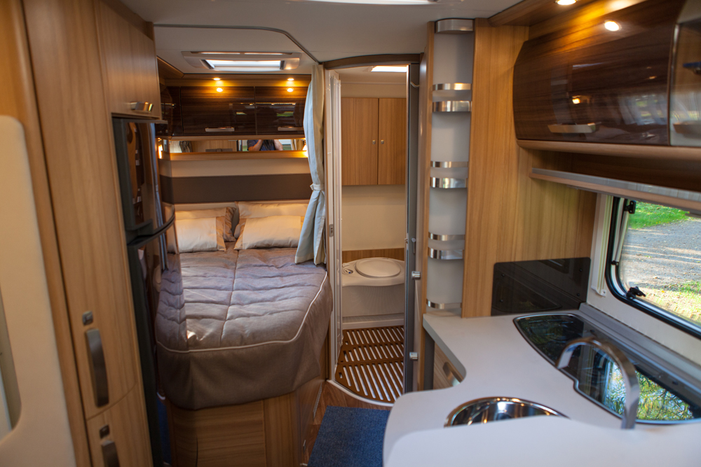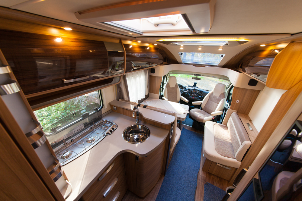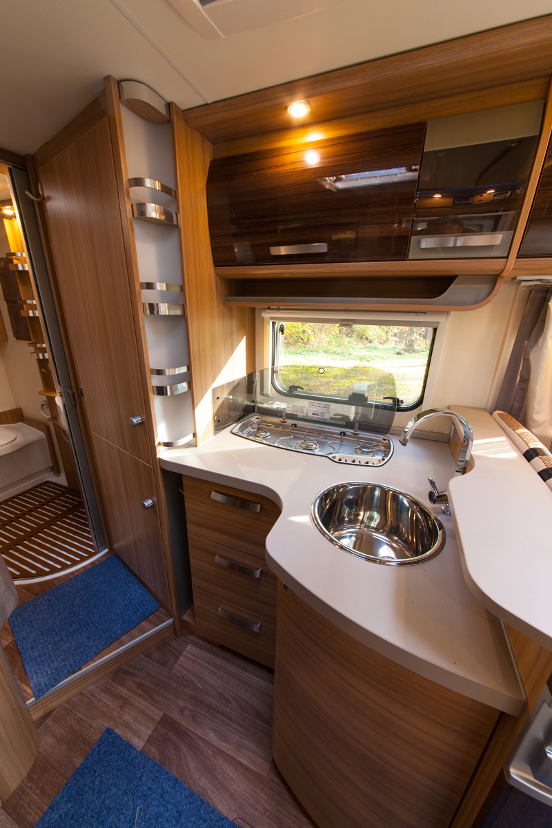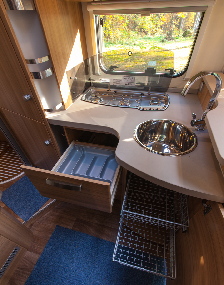 Avarassa keittiössä on L-mallinen 92 sentin levyinen työpöytä, johon on upotettu 3-liekkinen kaasuliesi, jossa on sähkösytytys. Oikealla on pyöreä teräksinen tiskiallas. Muhkea 190-litrainen jääkaappi on kokin selän takana auton oikealla sivulla.