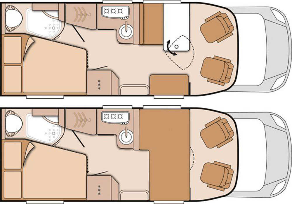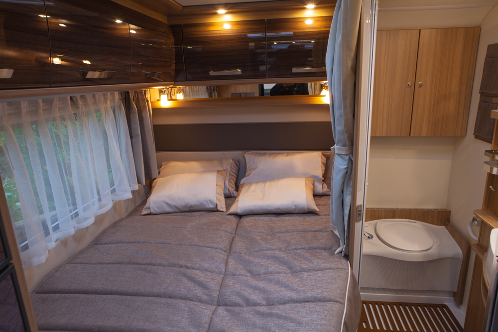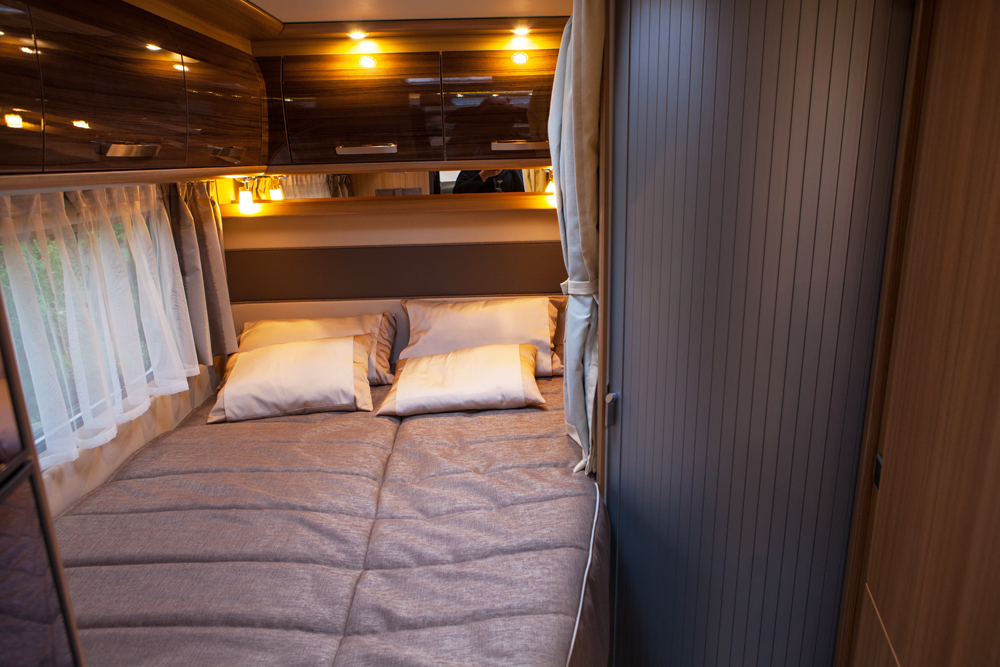 Vuodeksi 2015 Knausilla on tarjolla 29 erilaista matkailuautomallia. Koeajamamme puoli-integroidun Knaus Sun Ti 650 MF:n sijoittuu kooltaan Knaus-malliston keskivaiheille. Sun Ti-malleissa on takana makuutila kahdelle. Vaihtoehtoina on erillisvuoteet, parivuode poikittain tai kuten koeajomallissa, parivuode oikealla sivulla.
