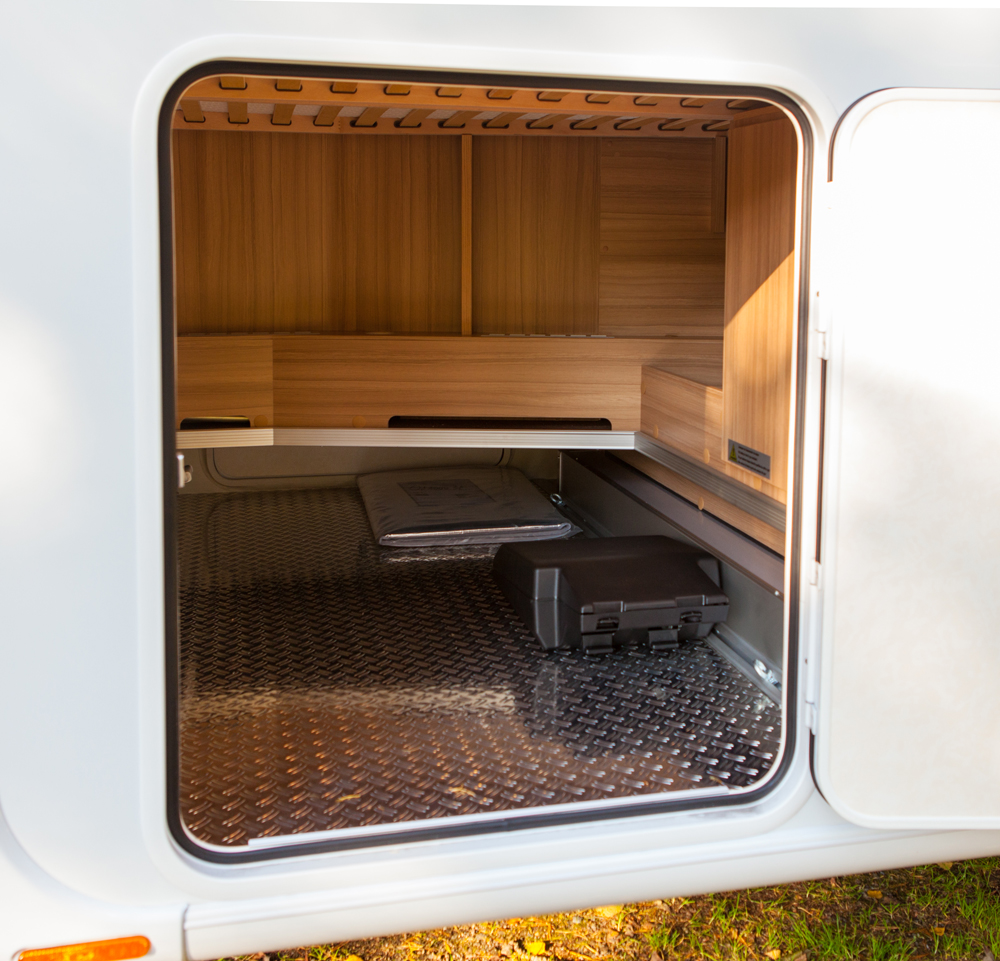 Vuoteen allapuolella takana on koko auton levyinen talli, jonne pääsee käsiksi myös sisältä vuoteen kantta nostamalla. Osa tilasta on 130 cm korkeaa, loppu jatkuu auton levyisenä vessan alle 28 cm korkeana.