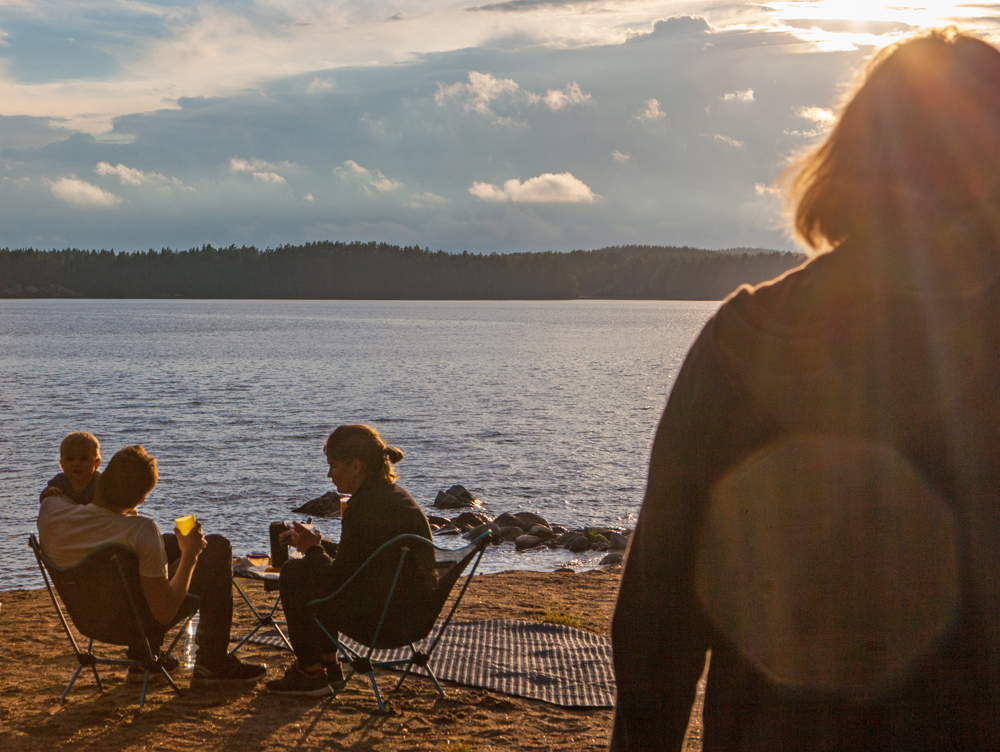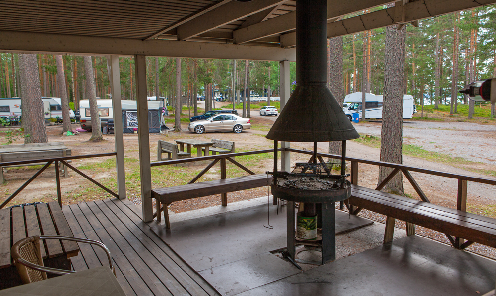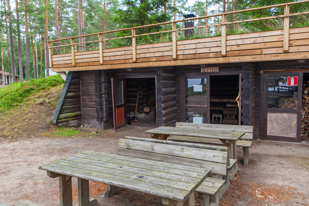 Toinen grillipaikka löytyy rannasta, jos tietää mistä etsiä. Leiriin suuntaan ei nimittäin näy muuta kuin maasta ulos pistävä savupiippu. Maahan kaivettu korsugrilli aukeaa rannan suuntaan ja sen edustalla on ulkopöytiä.