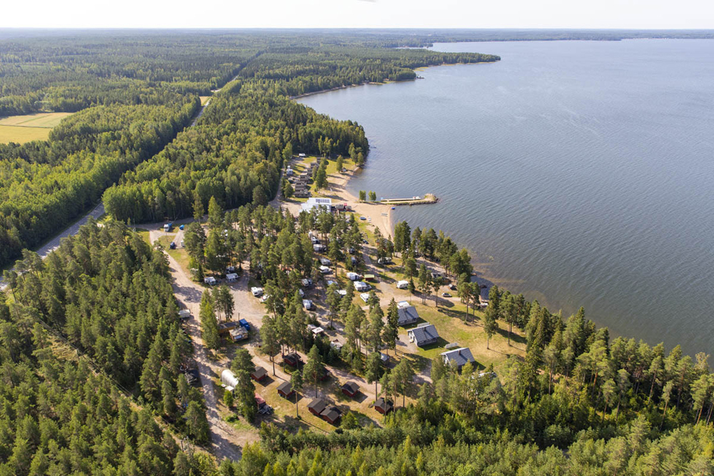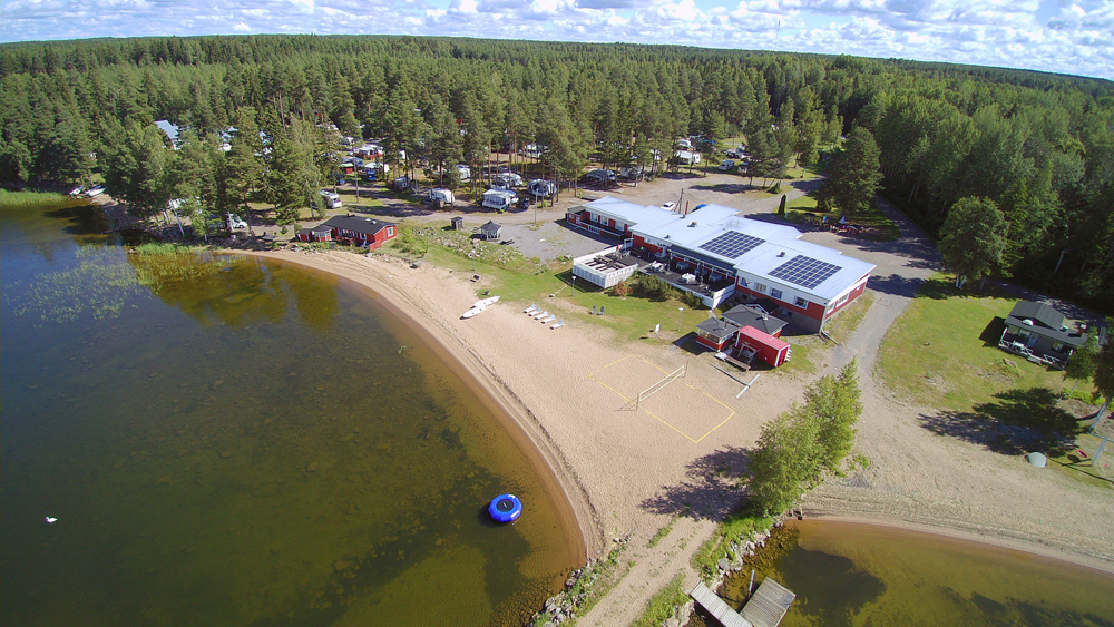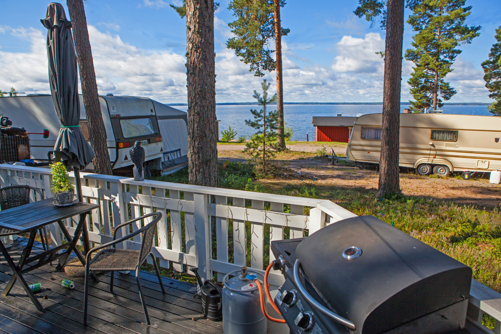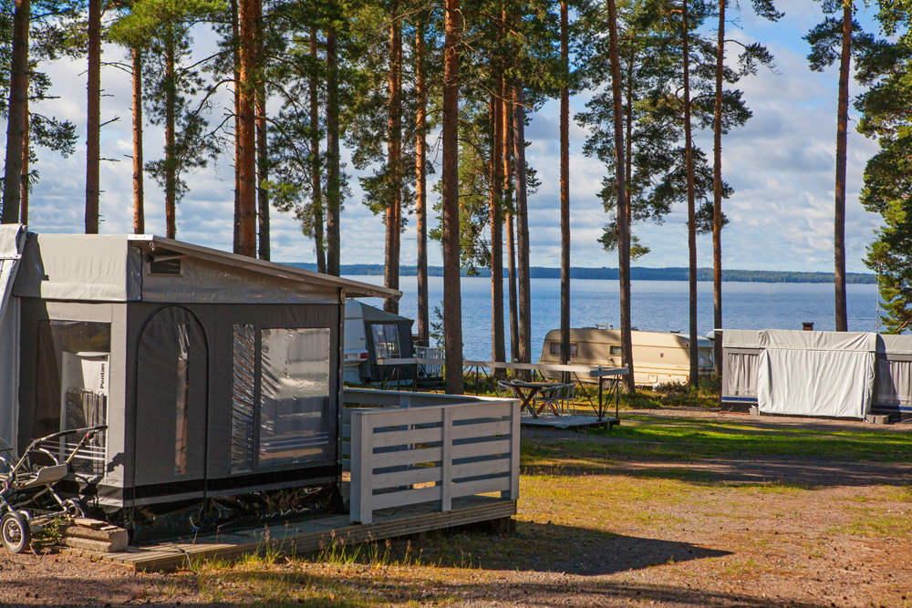 Caravan-alue sijaitsee ravintolan vieressä, hiekkapohjaisessa rantamännikössä. Alue on pidetty luonnonmukaisena puuston ympäröivänä maastona. Matkailuajoneuvopaikkoja on yhteensä 56. Reissaajille on varattuna 20 paikkaa. Kesäaikaan suosittelemme paikkavarausta soittamalla tai sähköpostilla, toivoo Eija. Yöpymishintaan kuuluu puupohjainen terassi. Näin hiekkakin pysyy paremmin vaunun ulkopuolella! Loppuja caravan-paikkoja miehittävät kausipaikkalaiset. Osa paikoista on lähellä rantaa, osa taaempana männikön suojassa.