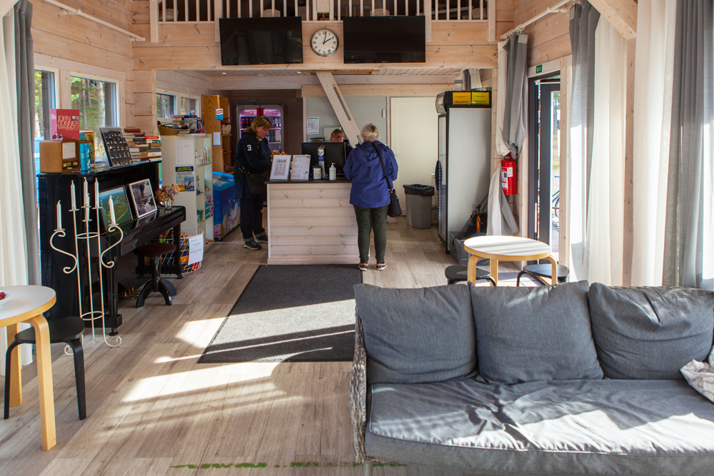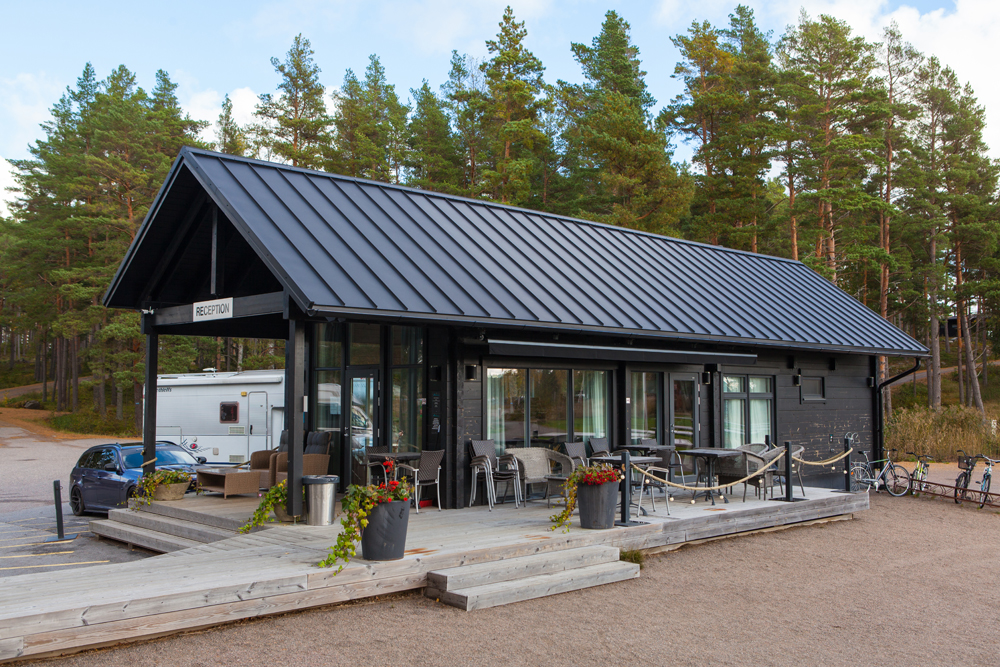 Portilla vastassa on tyylikäs mustapintainen toimistorakennus, jonka yhteydessä on baari ja terassi. Toimiston vieressä on pitkänmallinen huoltorakennus. Sekin hirsinen ja moderni musta. Huoltorakennuksessa on vessat ja suihkut, sekä päädyssä Kemssantyhjennys ja pyykinpesukoneet.