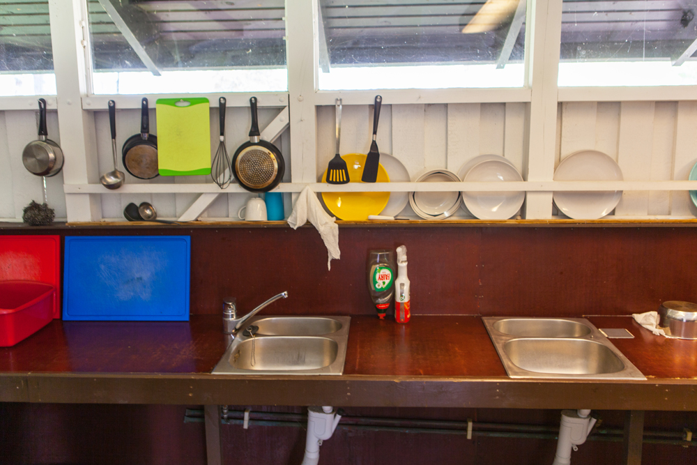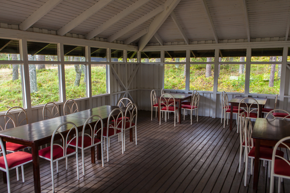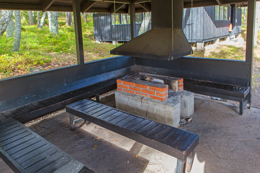 Rakennusten takana mäntymetsikössä on grillikatos sekä kesäkeittiö, jossa on paikat kokkaukseen ja tiskaukseen sekä toisessa huoneessa ruokailutilat.