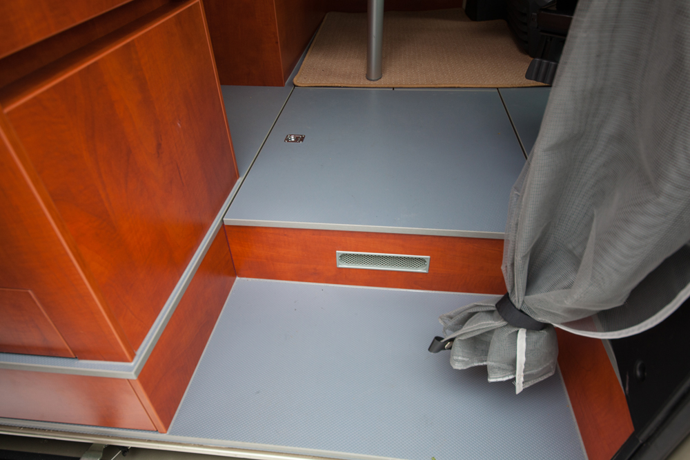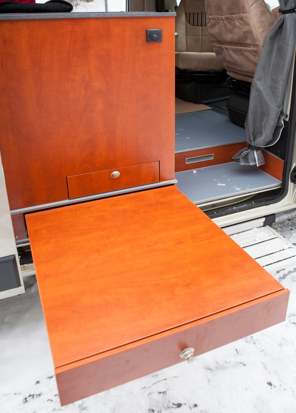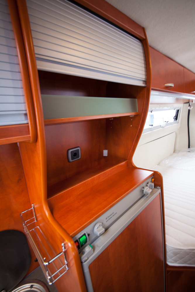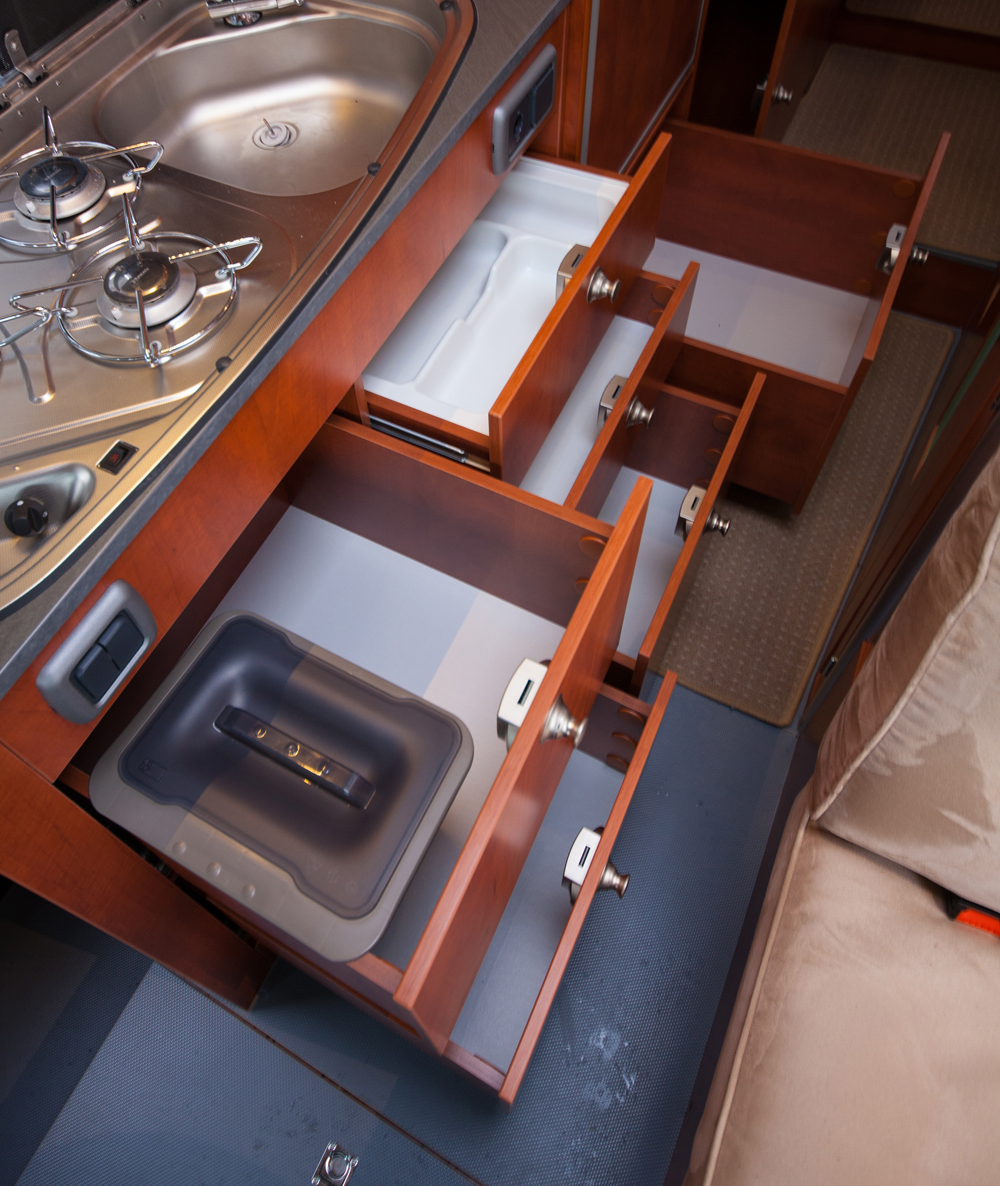 Tiskipöydässä on viisi vetolaatikkoa, jääkaapin alla on kuudes. Vetolaatikot ovat alakaappeja mukavampikäyttöiset. Ei tarvitse kyykistellä lattialle. Oikeanpuoleisessa ylälaatikossa on muovilokerikko aterimille. Vasemmassa on kannellinen roskis. Dometicin jääkaappi on tiskipöydän ja makuutilan välisessä kaappitilassa. Jääkaappi on 80-litrainen, sisältäen pakastelokeron. Jääkaapin päällä olisi hyvä paikka taulu TV:n telineelle, joka kääntyy olotilaan tai makutilaa.