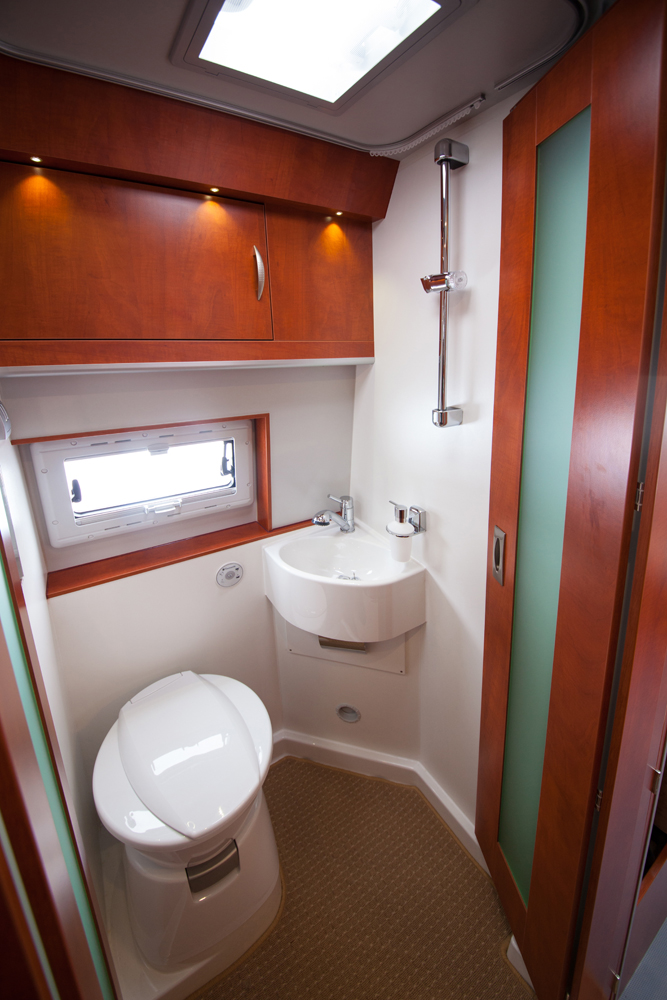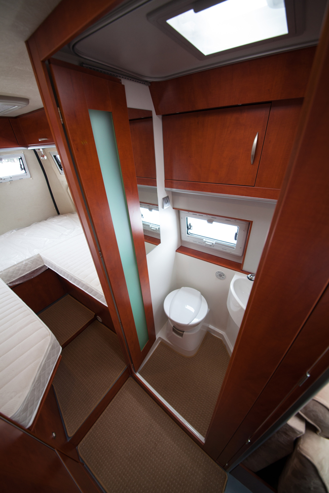 Vessan ovi on kaksiosainen ja aukeaa sisäänpäin, kiinni vessan seiniin. Koko käytävän puoleinen seinä on siis ovea. WC on harvinaisen avara peltikuoriseen autoon. Avaruutta lisäävät vaaleat pinnat sekä ikkuna ja kirkas kattoluukku. Säilytystilana vessassa on suurehko yläkaappi.