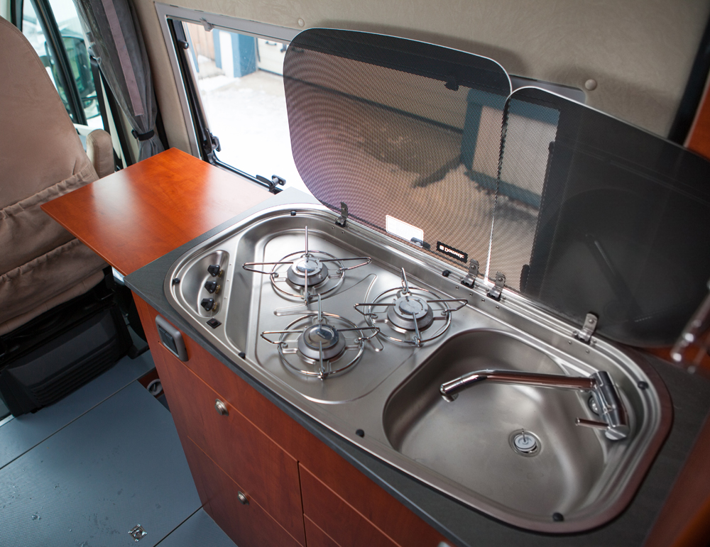 Keittiön tiskipöydässä on kaasuliesi ja pesuallas samaa kokonaisuutta. Tiskipöydän päässä on reilunkokoinen ylöskäännettävä työtaso.
