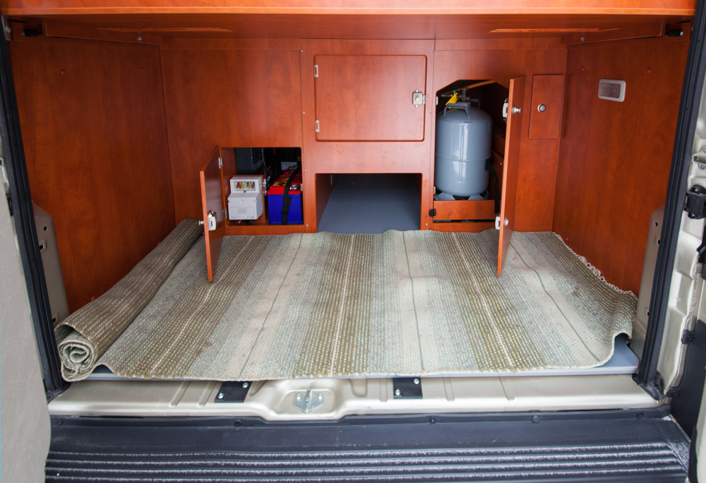 Ducaton peräovien takana vuoteen alla on tilava 184 sentin levyinen takatalli. Syvyyttä on 70 senttiä ja korkeutta 86 cm. Tallin perällä on kaappi kahdelle 11 kilon kaasupullolle sekä toinen akulle. Jos tavaraa on paljon, joudutaan kaasupulloa vaihtaessa osa tavaroista siirtämään muualle. Ja kaasupullohan tyhjenee perimätiedon mukaan aina noin kolmen aikaan aamuyöstä.