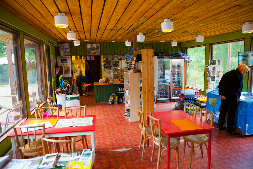 Kahvila yhteydessä on alueen toimisto. Alakerrassa on vessat ja suihkut. Vessoja ja suihkuja on myös muualla alueella.
