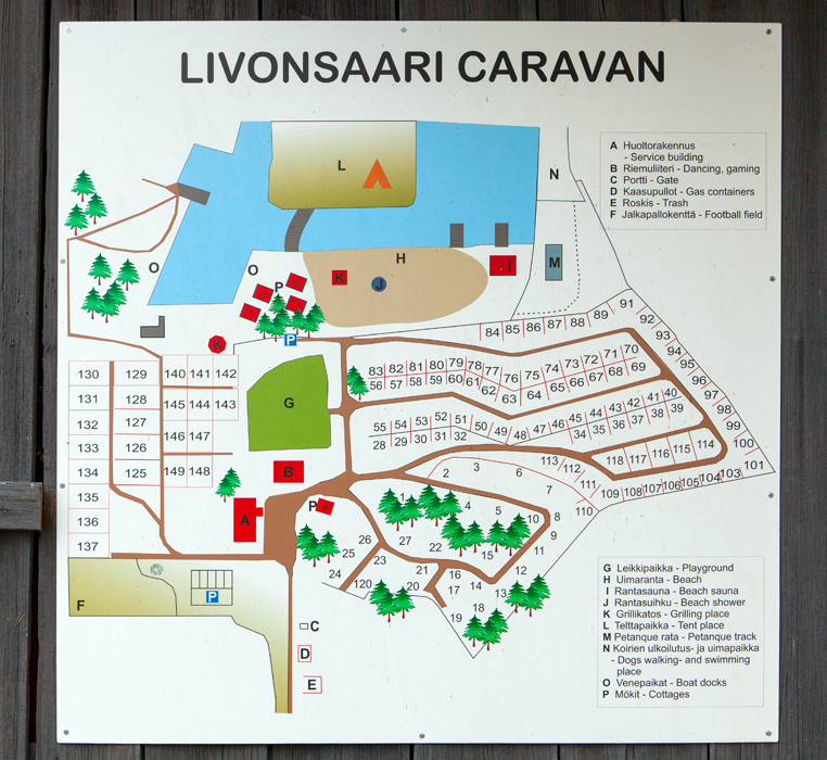 Paikka jakaantuu keskellä olevan metsäsaarekkeen ansiosta useampaan alueeseen ja tuo maisemaan vaihtelua. Osa matkailuajoneuvopaikoista on huoltorakennuksen lähelle, osa rannassa lähellä uimarantaa ja saunaa. Keskellä aluetta mäennyppylällä kasvaa vahvaa metsää, jonka suojissa on myös useita matkailuajoneuvopaikkoja. Rannasta löytyy myös muutama leirintämökki. Kausipaikkoja Livonsaaressa on paljon mutta vieraspaikkoja pidetään aina riittävästi.