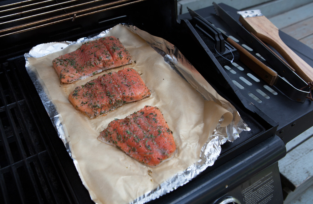 Kuumenna parila. Laita parilalle folio ja leivinpaperi. Parila ei rähjäänny ja leivinpaperi estää kalaa palamasta kiinni.