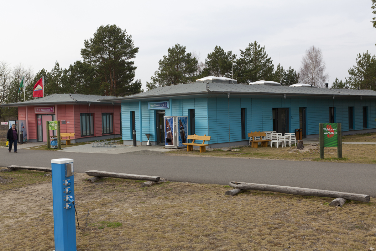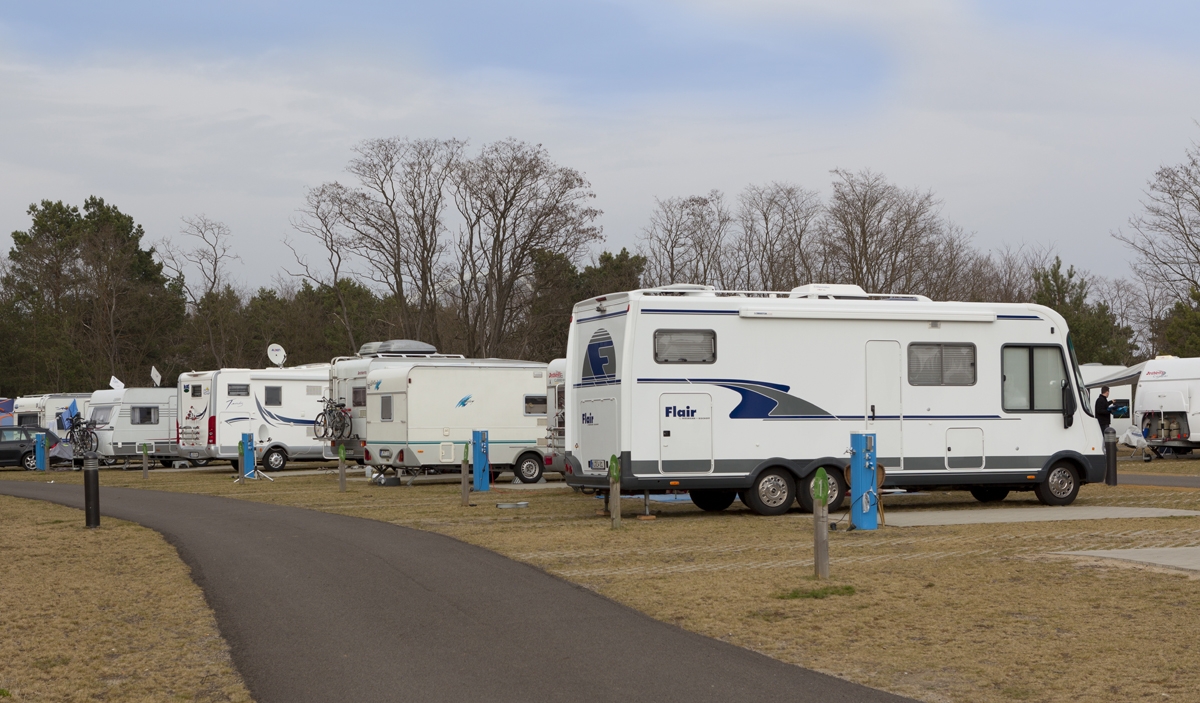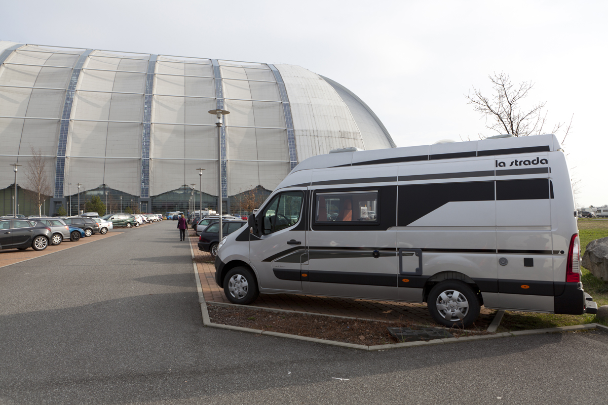 Zeppelin-hallin vieressä on suuri pysäköintialue, jossa voi yöpyä matkailuajoneuvolla, ihan luvan kanssa. Parkkipaikalla mekin nukumme. Vaikka on huhtikuu ja arkipäivä, caravan-alue on täynnä.