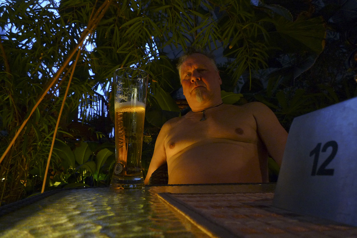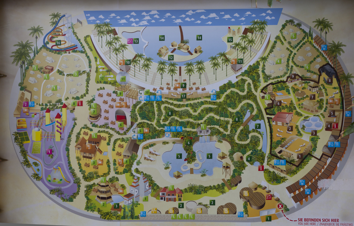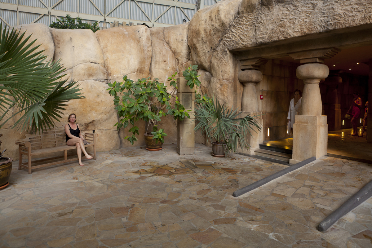 Toisessa päässä hallia hieostetaan ihmisiä, muttei onneksi DDR:n tyyliin. Suuri saunaosasto on jaettu erityyppisiin alueisiin. Täältä löydämme monenlaista höyryhuonetta ja yrttisaunaa. Yksi saunarakennus on saanut muotonsa Ankor Watt-temppelistä, toinen Uudesta Seelannista. Elefanttitemppeli on rakennettu intialaisten pyhättöjen mallilla. Balilainen sauna on korkeammalla pylväiden varassa, kristallisaunat taas luolastossa.