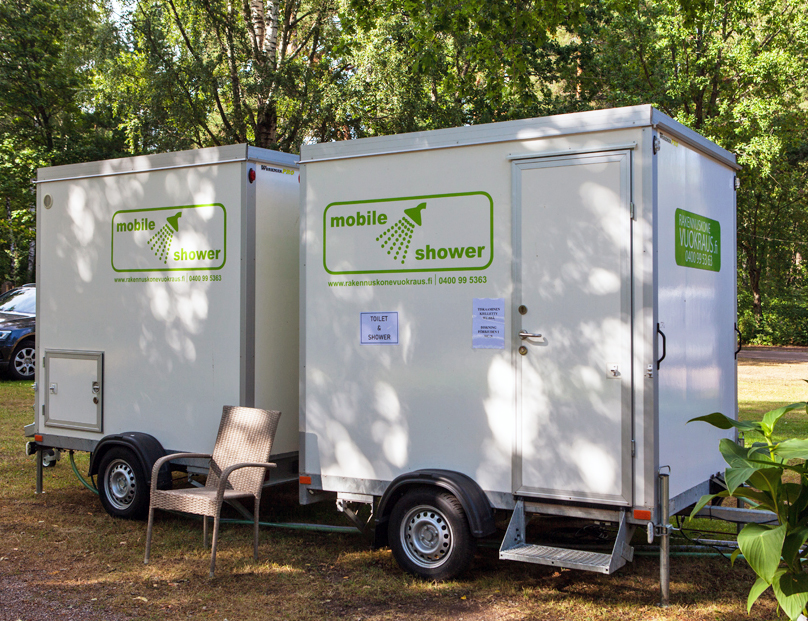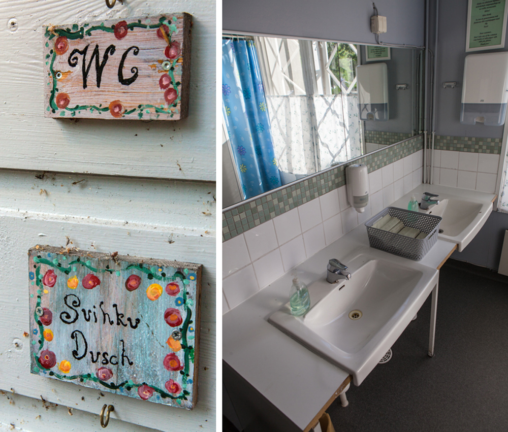 Rakennuksen toisessa päässä on huoltotilaa: vessat, suihkut, kemssantyhjennys. Keittiössä on myös pyykinpesukone ja kuivausrumpu. Ulkona vesipisteen yhteydessä on hyvän sään tiskipaikka. Päärakennuksen takana kaksi pyörillä liikuteltvaa konttia, joissa on modernit vessat ja suihkutilat.