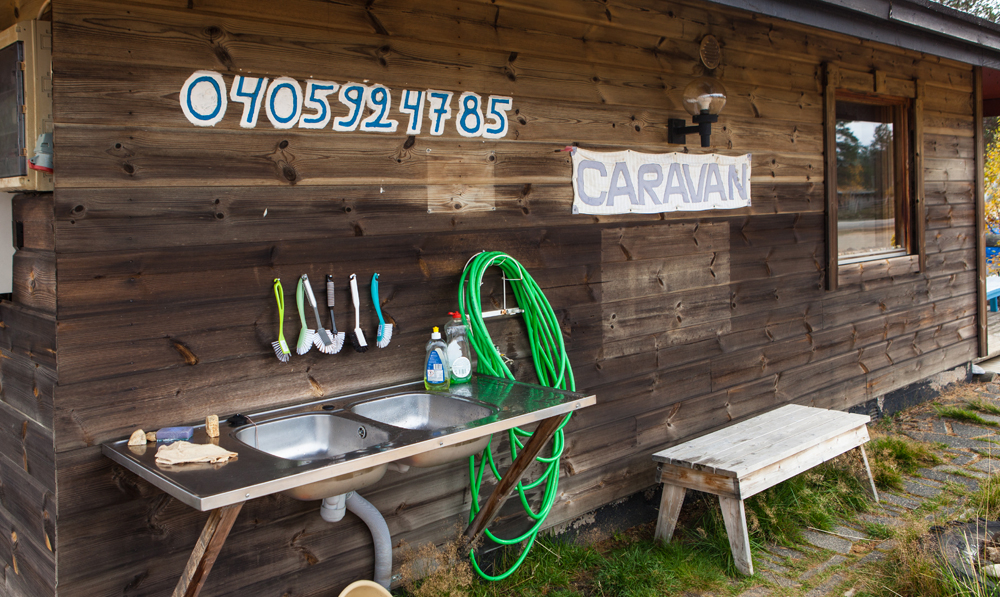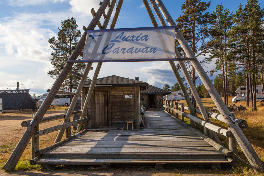 KaksCaravan sijauitsee mukavasti heti 4-tien varrella. Tulijoita tervehtii kaus näkyvä muhkea puuportti. Sen takana seisoo pieni hirsinen toimisto, jossa on myös kahvila.