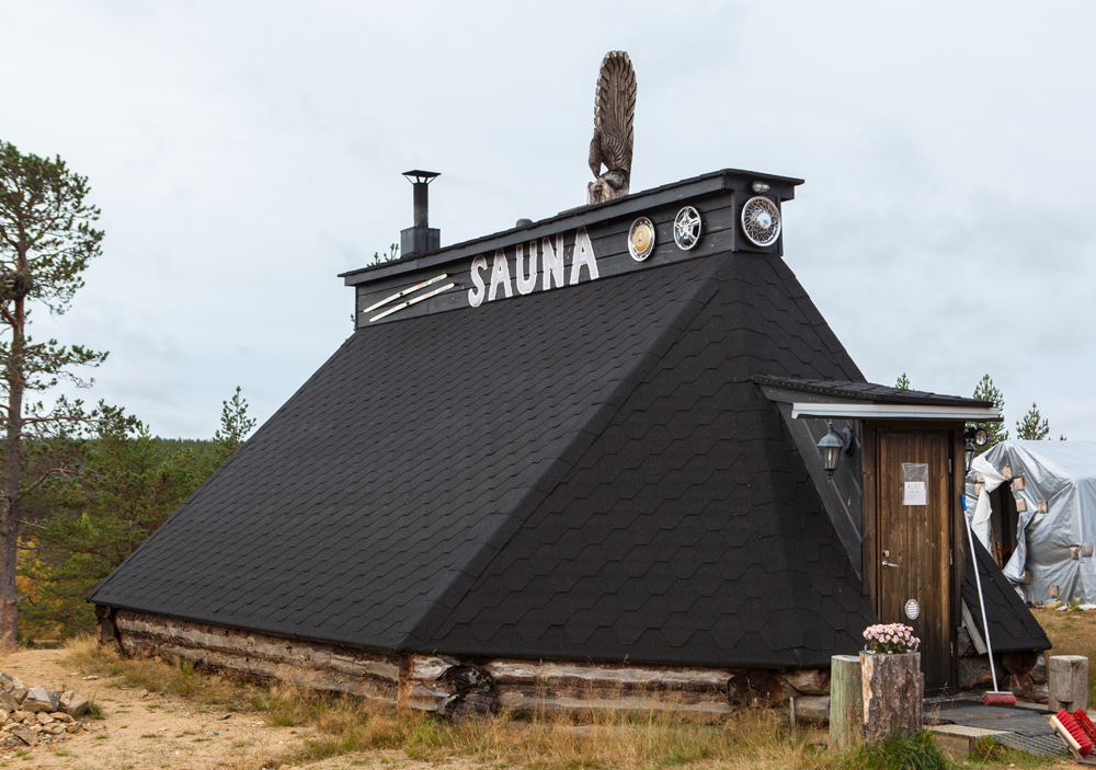 Sauna on erikoisen mallinen. Se muistuttaa pitkäksi venytettyä mustaa kotaa.