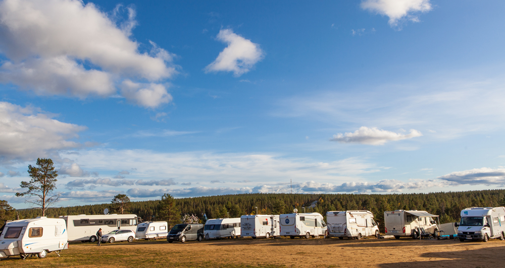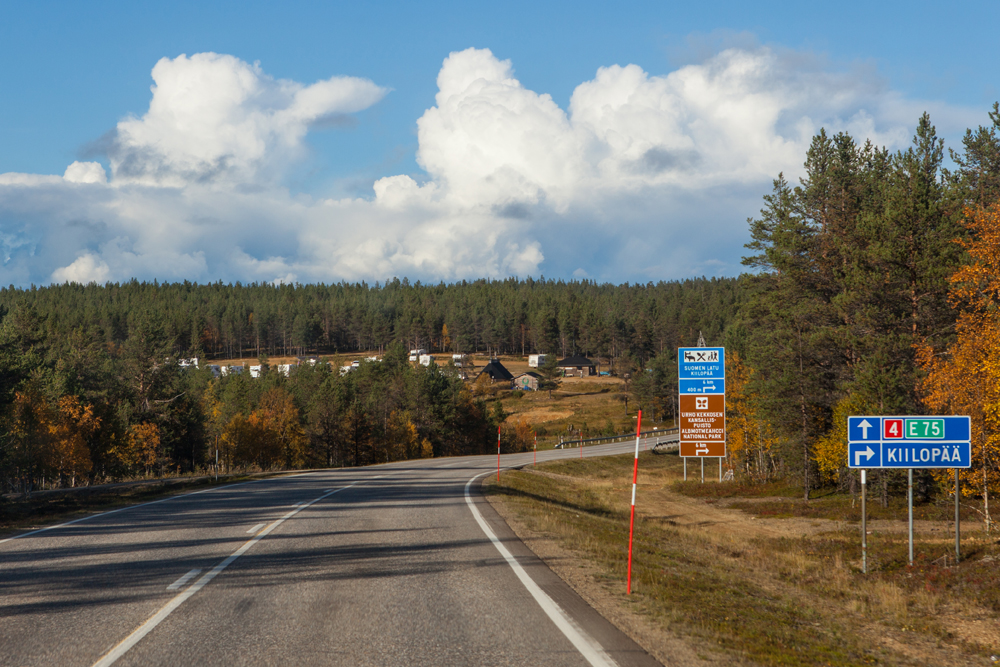 Kun lähestytään etelästä Saariselkää näkyy jo kauempaa Kakaslautasen risteykseen laskevalle tielle joukko Kakslauttasjoen rannan lähelle majoittuneita matkailuajoneuvoja...