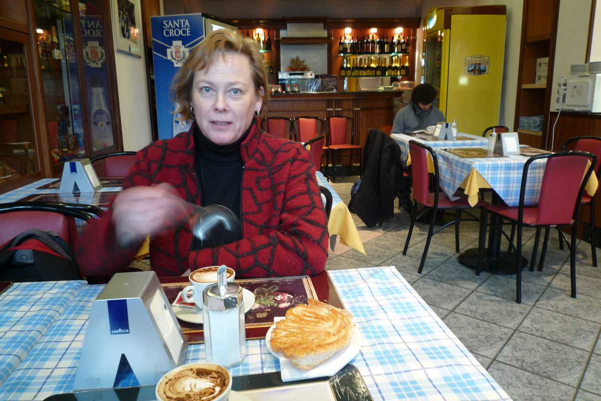 Kiertelemme useissa kahviloissa. 2 kahvia ja pullat yhteensä 3 euroa. Suomessa ei olisi saanut yhtä pullakahvia.