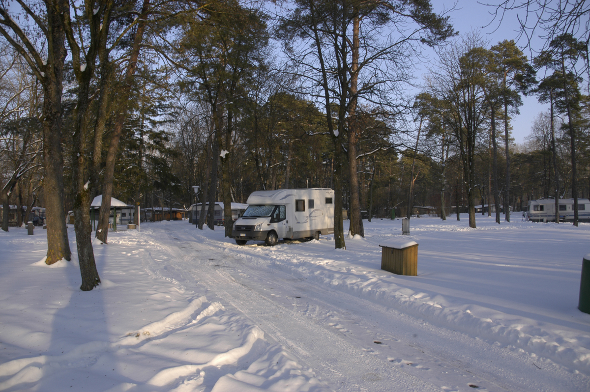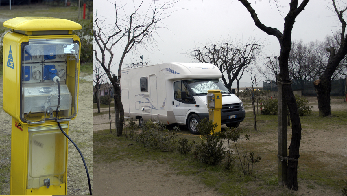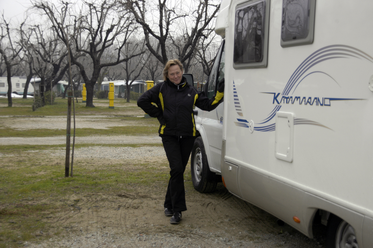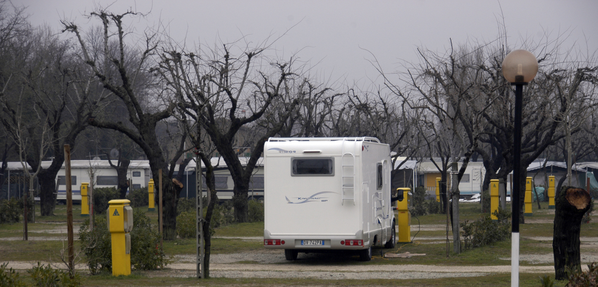 Selviämme tuiskusta ehjänä ja lipsumatta. Laskeudumme ”lämpimälle” Adrianmeren rannalle Riminiin, josta olemme etsineet etukäteen caravan-alueen. Tehtävä ei ollutkaan helppo. Jokaisen alueen aukiolotiedot piti käydä katsomassa netistä erikseen. Mitään selkeää luetteloa talvialueista ei ole. (Tässä olisi haastetta suomalaisille alueillekin.)