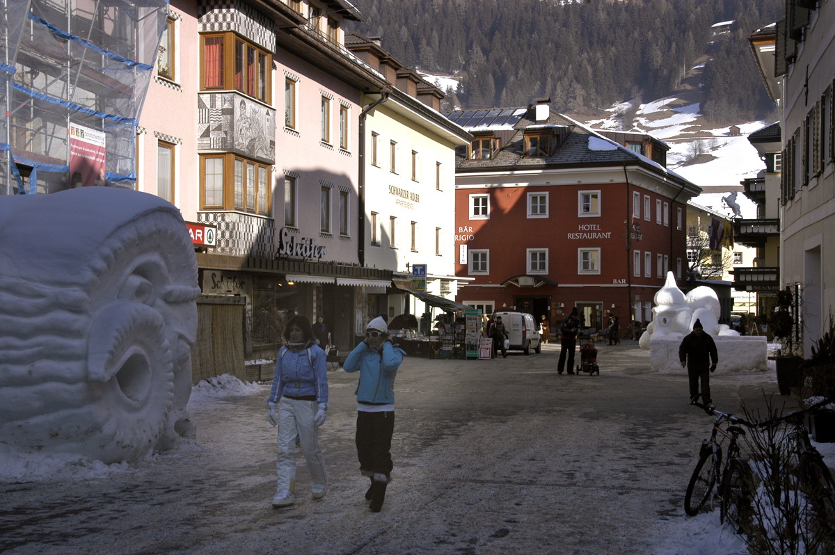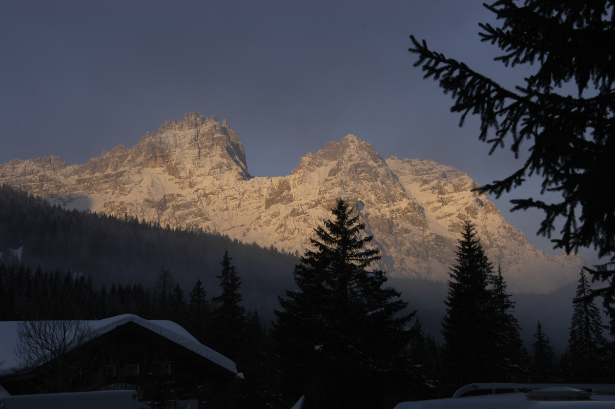 Maisema vaihtuu vähitellen vuoristoisemmaksi ja talot tyrolilais-tyylisiksi. Italian Alpit ovat aikanaan olleet osa Tyrolin valtiota. Monet paikannimet ovat saksaksi, kuten päämäärämme Sexten/Sesto. Ensimmäiset näkymät korkeista lumisista Alpeista ovat sykähdyttäviä. Loppumatka ajetaan kapeaa serpentiiniä lumivallien keskellä. Onneksi tien on sula ja kuiva.