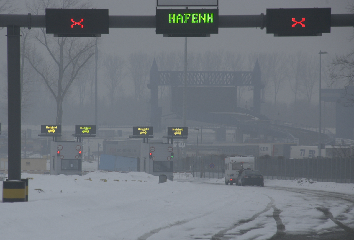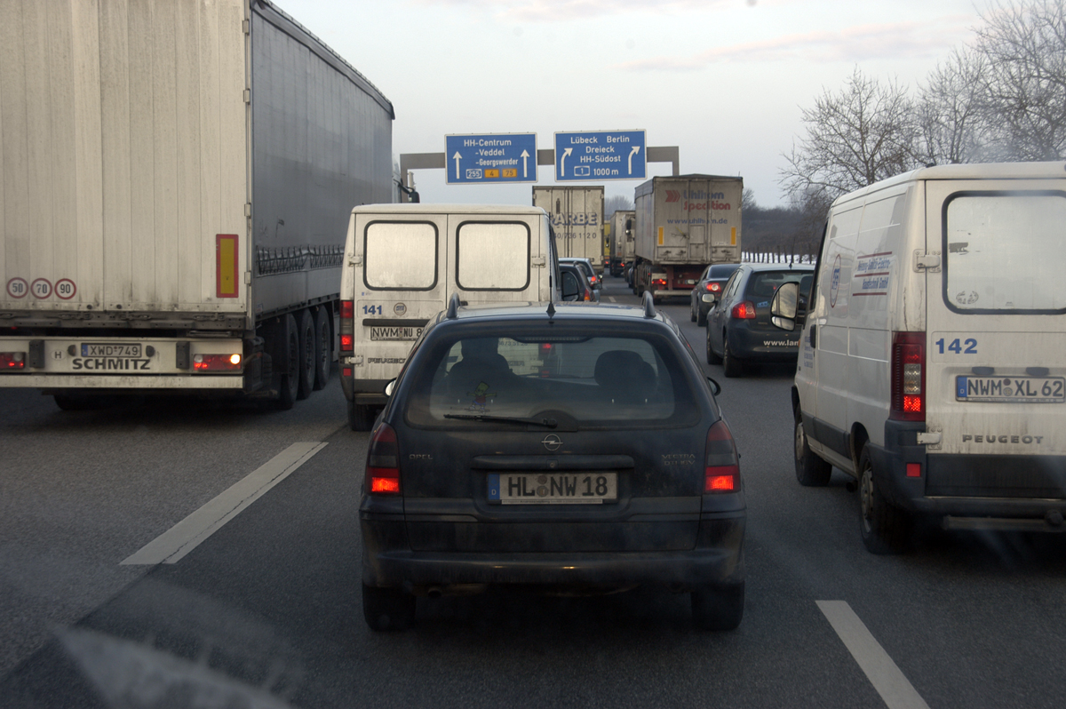 Lähestyessämme Pohjoisrannikkoa ja Travemündea alkavat rekkajonot lisääntyä.