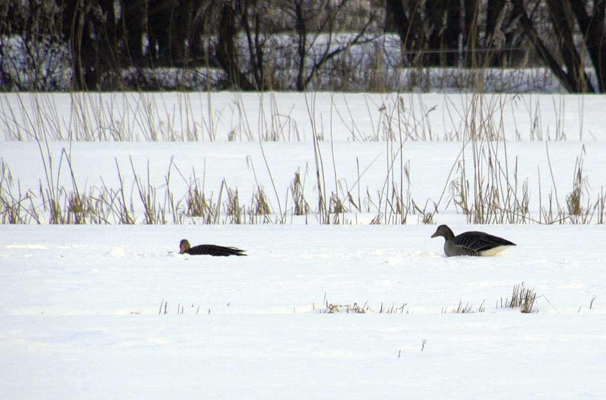 Mereltä on puhallellut kova tuuli ja kasannut valtavia kinoksia saaren niityille. Hankeen on jäänyt talvehtimaan hämmästyttävän suurin joukoin vesilintuja. Hangessa liikkuu myös valtavasti kaneja??