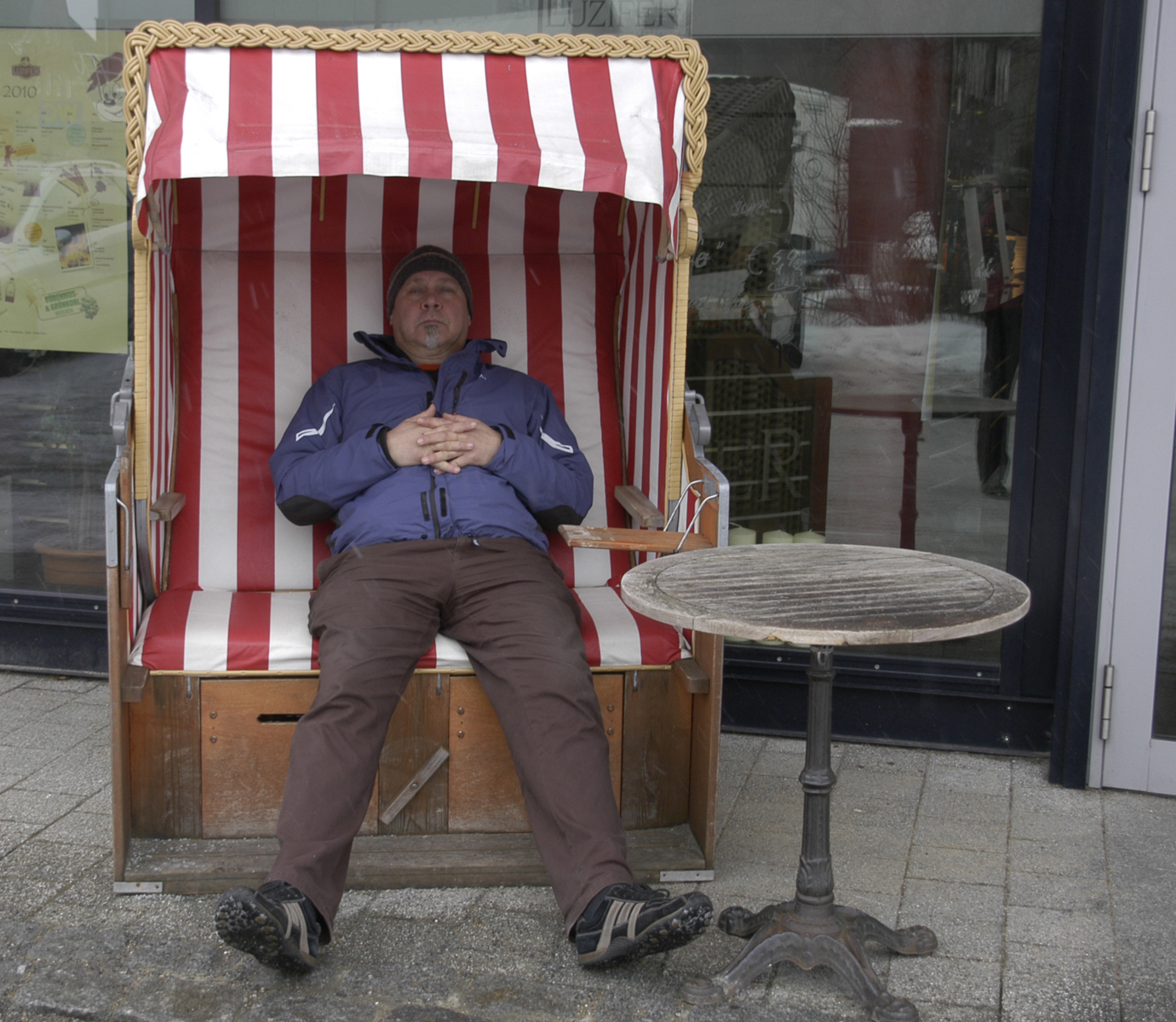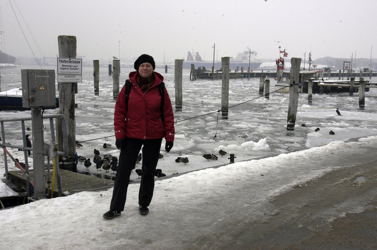 Aamulla on kova sumu ja napakka tuuli tiuskii mereltä. Pakkasta on hiukan mutta tiet on suolattu. Surkein keli tähän mennessä. Onneksi ajoimme eilen näin lähelle satamaa. Poikkeamme luostariin. Kiinni on. Käymme Travemünden kylälle. Käpyttelemme ja syömme rantapaviljongissa herkulliset pastat.