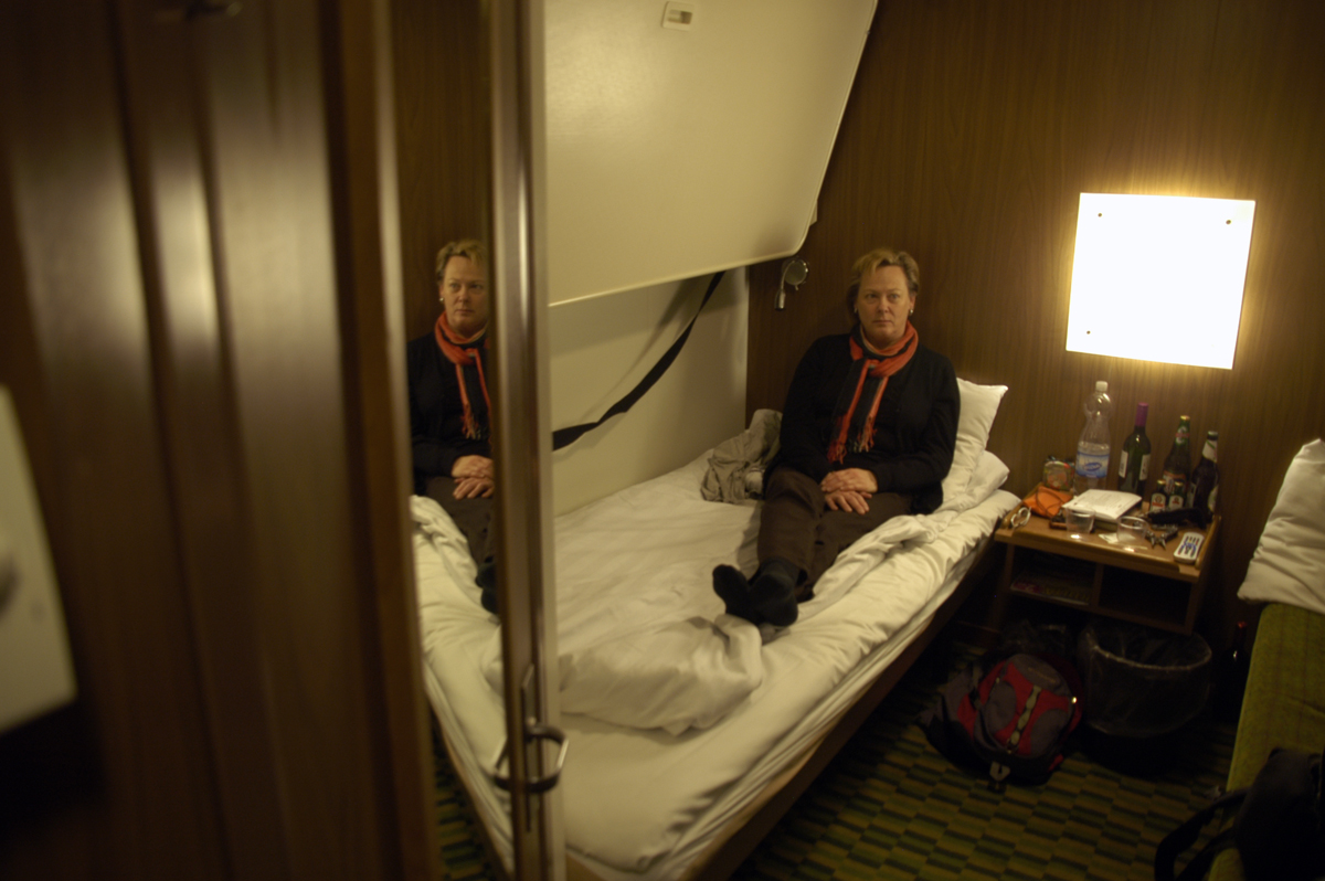 Merellä on sumua. Laivalla syödään ja katsellaan telkkaria.