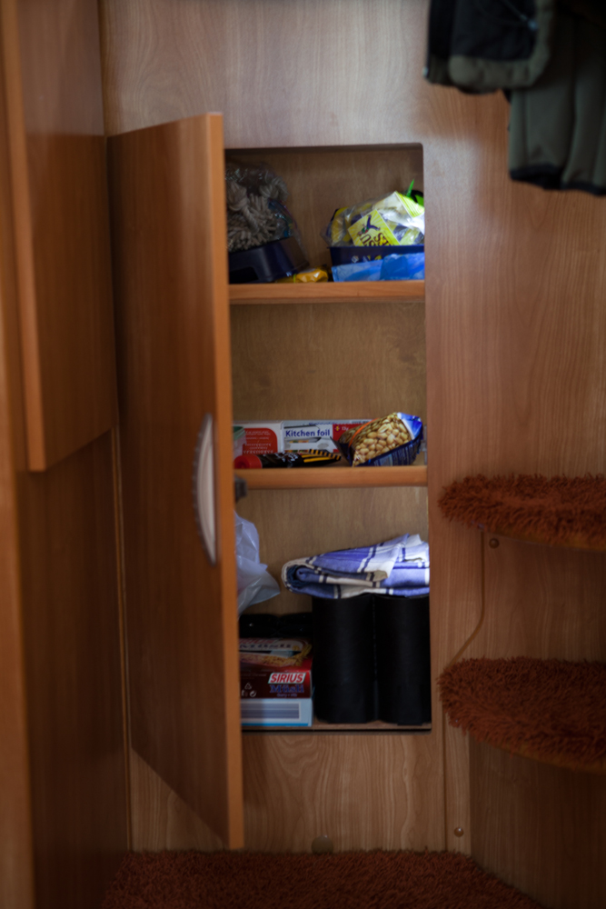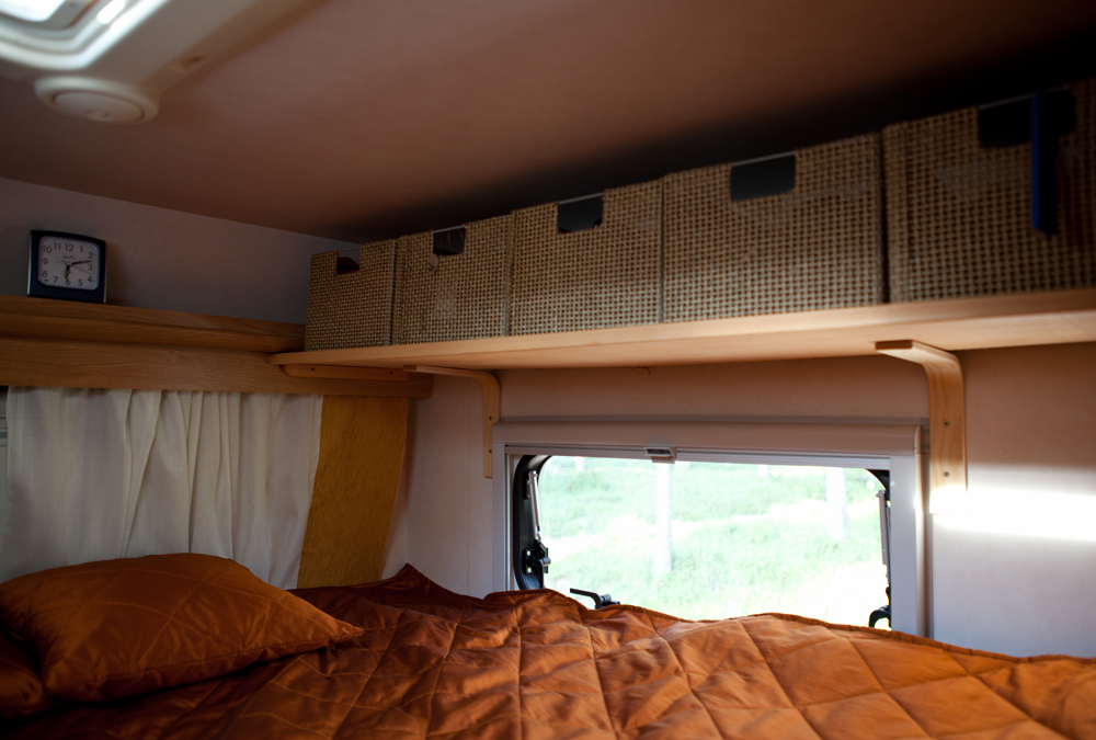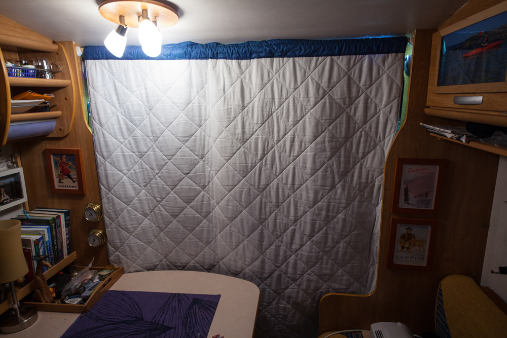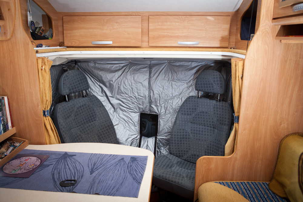Ohjaamon ja asumistilan väliin tehtiin väliverho lyhyempiä ajomatkoja varten, kun koko autoa ei tarvitse lämmittää. Siistimpi puoli on ohjaamon puolella. Verho toimii myös eräänlaisena varkaiden hillitsijänä kun asuinosan TV ja muut varusteet eivät näy ulos.