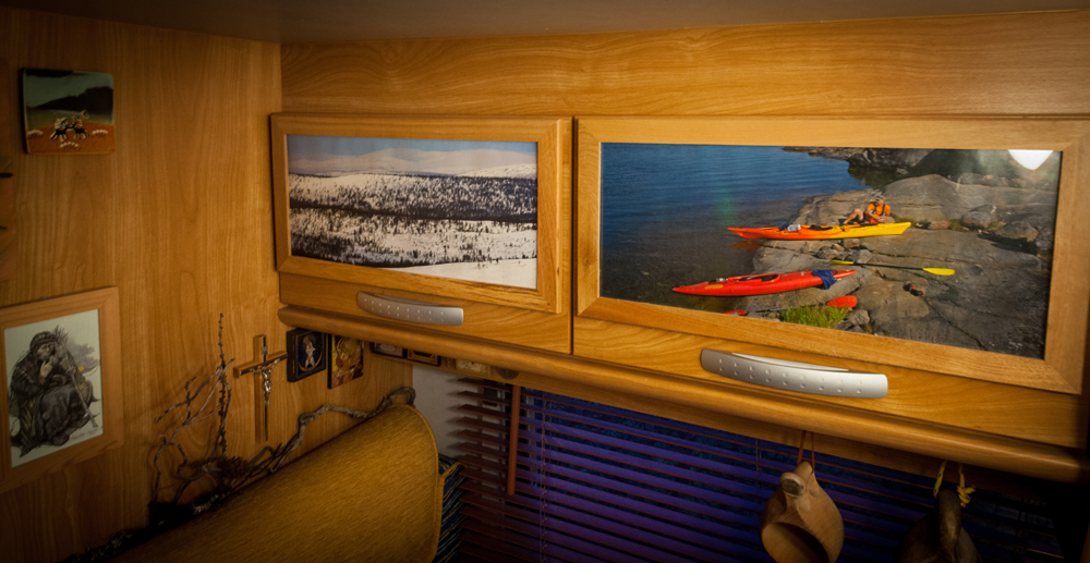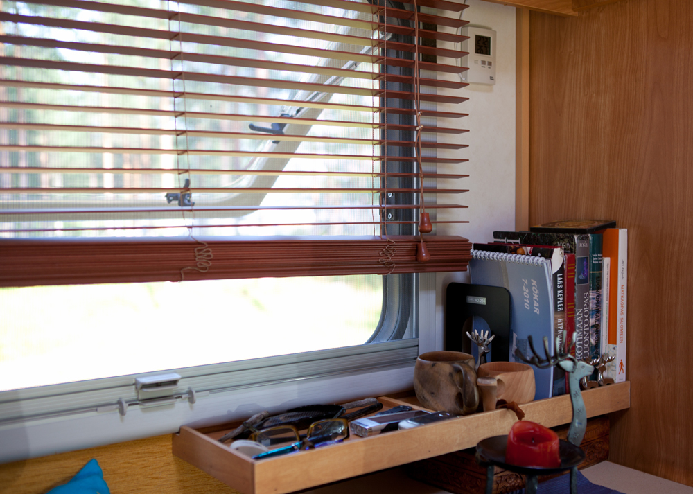 Pöydän päähän ikkunan alle tehtiin reunallinen hylly pikkutavaroille, matkamuistoille ja muutamalle lähes päivittäin käytössä olevalle kirjalle, kuten auton ”lokikirja”, pari luonto-opasta ja matkaopas Suomeen.