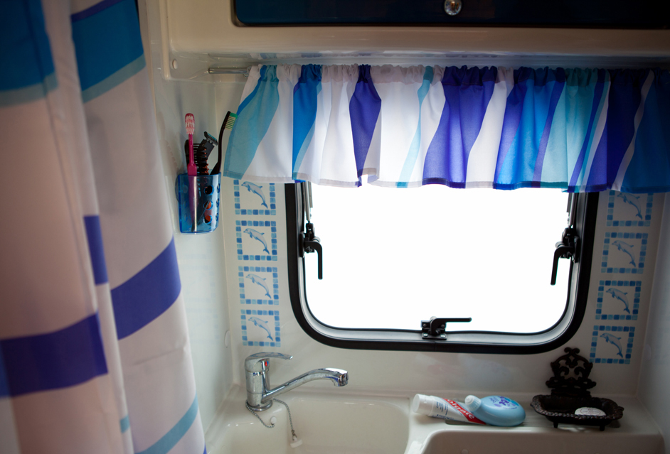 Vessa ja suihkutila on valkoinen muovielementti. Suihkuverhokin oli valkoinen ja ohutta muovia. Sen tilalle vaihdettiin sinikuvioinen kankainen suihkuverho. Pituudesta riitti pätkä vielä vessan ikkunaan yläkapaksi. Verhotanko saatiin olohuoneesta irrotetusta tangosta. Seinälle tuli koristeeksi muutamia merihenkisiä tarrakohokuvioita – auton merellisen Katamarano-nimen mukaan. Lattialle vielä sinikuvioinen pitkäkarvainen kylppärimatto, oikeaan muotoon leikattuna ja päärmättynä. Suihkutilassa on vaakatanko, missä kuivataan saunatakit, pyyhkeet ja umapuvut.