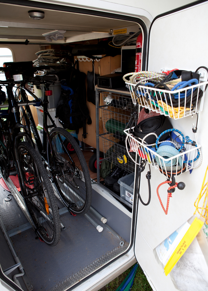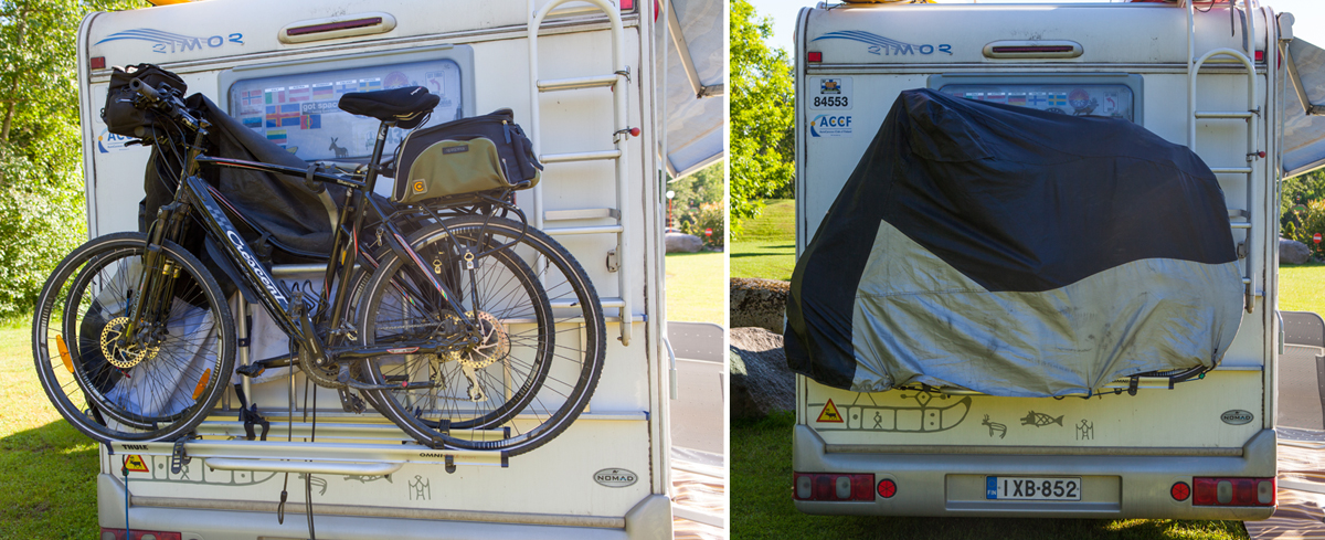 Joskus tavaraa on niin paljon, etteivät pyörät mahdu takatalliin. Siksi perään asennettiin teline kahdelle polkupyörälle. Telineessä on helppo tarvittaessa kuljettaa muitakin varusteita. Polkupyörät kannattaa suojata pölyltä ja kuralta hupulla.